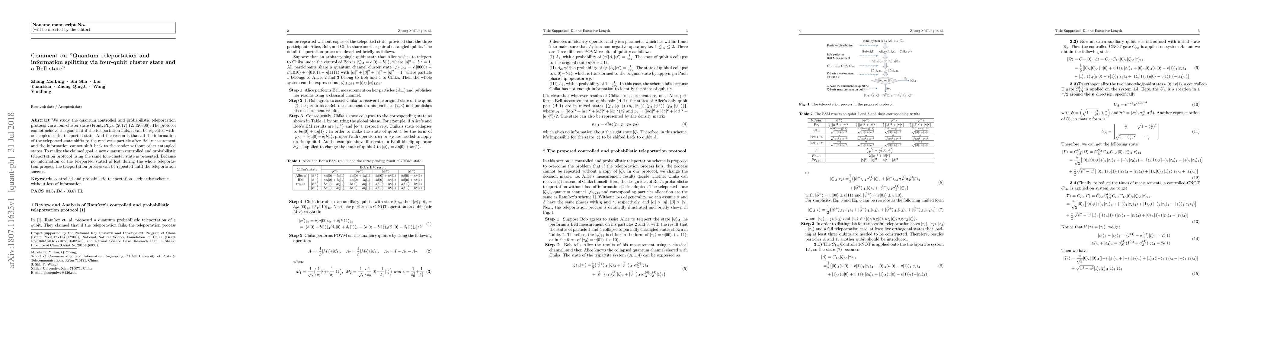 This paper discusses a quantum teleportation protocol using a four-qubit cluster state and a Bell state, highlighting its limitations in repeatability when teleportation fails. It proposes a new protocol that retains all information during teleportation, allowing for repeated attempts until successful.