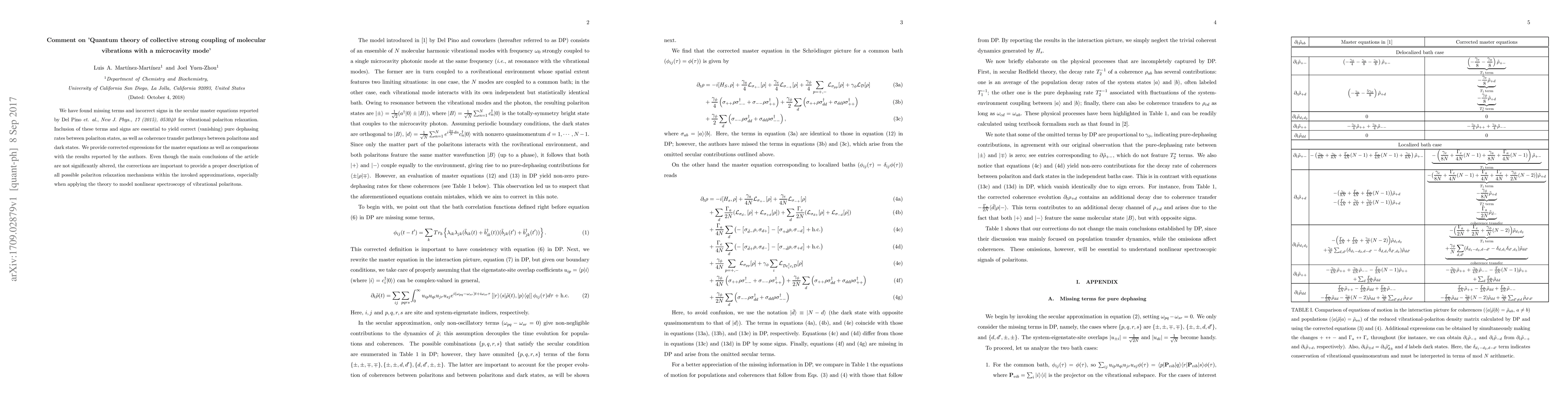 We have found missing terms and incorrect signs in the secular master equations reported by Del Pino et. al., New J. Phys., 17 (2015), 053040 for vibrational polariton relaxation. Inclusion of these terms and signs are essential to yield correct (vanishing) pure dephasing rates between polariton states, as well as coherence transfer pathways between polaritons and dark states. We provide corrected expressions for the master equations as well as comparisons with the results reported by the authors. Even though the main conclusions of the article are not significantly altered, the corrections are important to provide a proper description of all possible polariton relaxation mechanisms within the invoked approximations, especially when applying the theory to model nonlinear spectroscopy of vibrational polaritons.