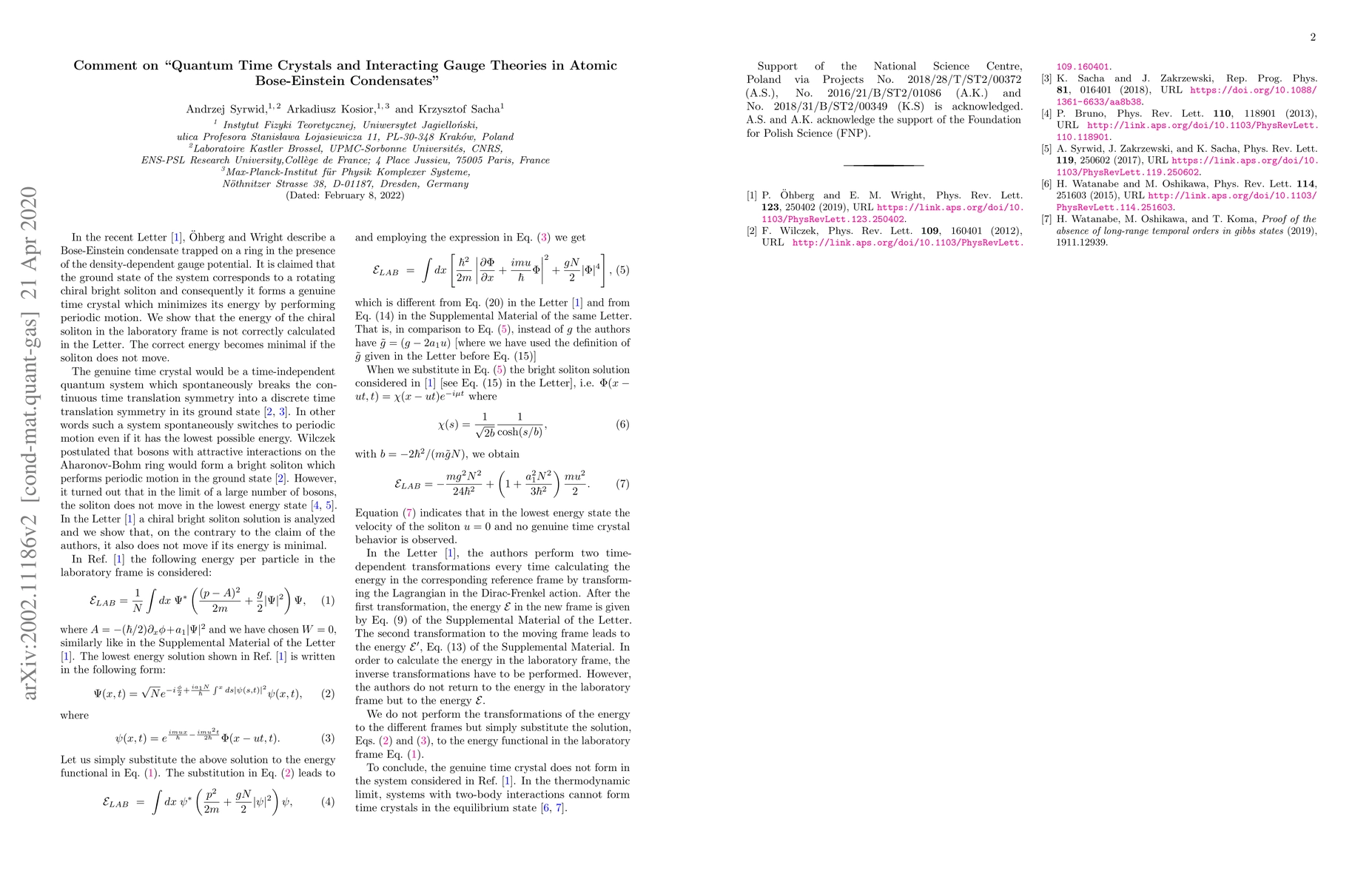 In a recent letter [Phys. Rev. Lett. 123, 250402], \"Ohberg and Wright describe a Bose-Einstein condensate trapped on a ring in the presence of the density-dependent gauge potential. It is claimed that the ground state of the system corresponds to a rotating chiral bright soliton and consequently it forms a genuine time crystal which minimizes its energy by performing periodic motion. We show that the energy of the chiral soliton in the laboratory frame is not correctly calculated in the letter. The correct energy becomes minimal if the soliton does not move.