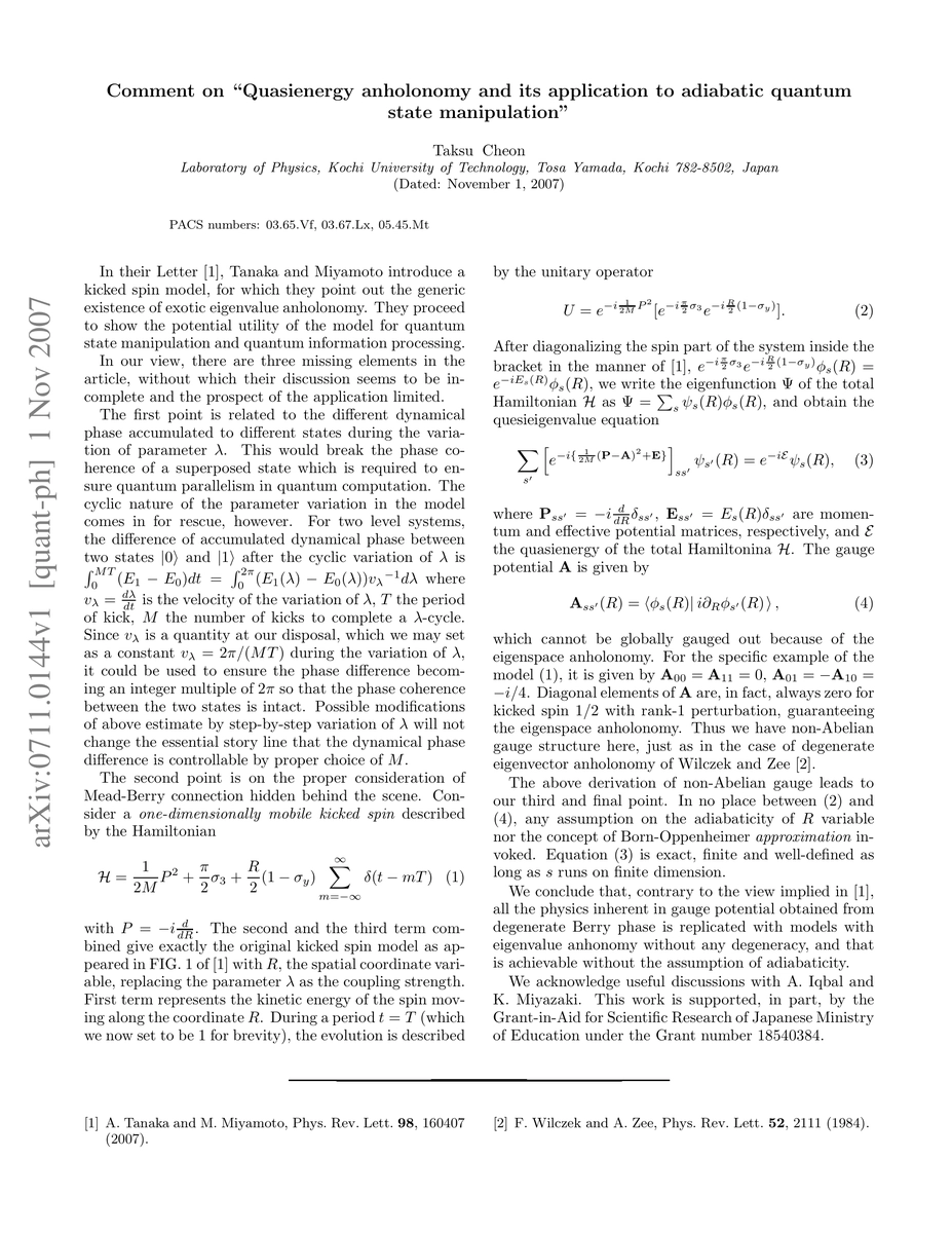 In their Letter [A. Tanaka and M. Miyamoto, Phys. Rev. Lett. 98, 160407 (2007)], Tanaka and Miyamoto introduce a kicked spin model, for which they point out the generic existence of exotic eigenvalue anholonomy. They proceed to show the potential utility of the model for quantum state manipulation and quantum information processing. While we believe their model to be vary useful and their argument to be revealing, In our view, there are three missing elements in the article, without which their discussion seems to be incomplete and the prospect of the application limited. They are on dynamical phase, gauge potential, and on adiabaticity.