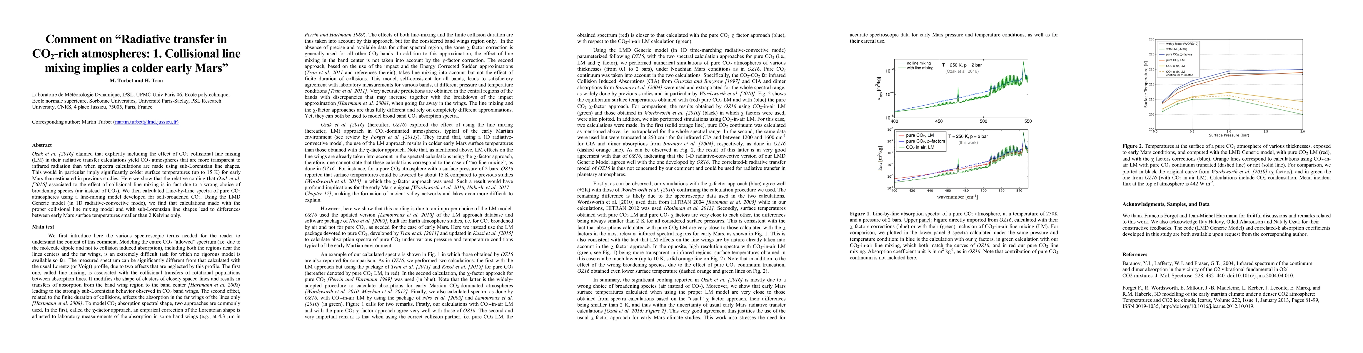 Ozak et al. [2016] claimed that explicitly including the effect of CO$_2$ collisional line mixing (LM) in their radiative transfer calculations yield CO$_2$ atmospheres that are more transparent to infrared radiation than when spectra calculations are made using sub-Lorentzian line shapes. This would in particular imply significantly colder surface temperatures (up to 15K) for early Mars than estimated in previous studies. Here we show that the relative cooling that Ozak et al. [2016] associated to the effect of collisional line mixing is in fact due to a wrong choice of broadening species (air instead of CO$_2$). We then calculated Line-by-Line spectra of pure CO$_2$ atmospheres using a line-mixing model developed for self-broadened CO$_2$. Using the LMD Generic model (in 1D radiative-convective mode), we find that calculations made with the proper collisional line mixing model and with sub-Lorentzian line shapes lead to differences between early Mars surface temperatures smaller than 2 Kelvins only.