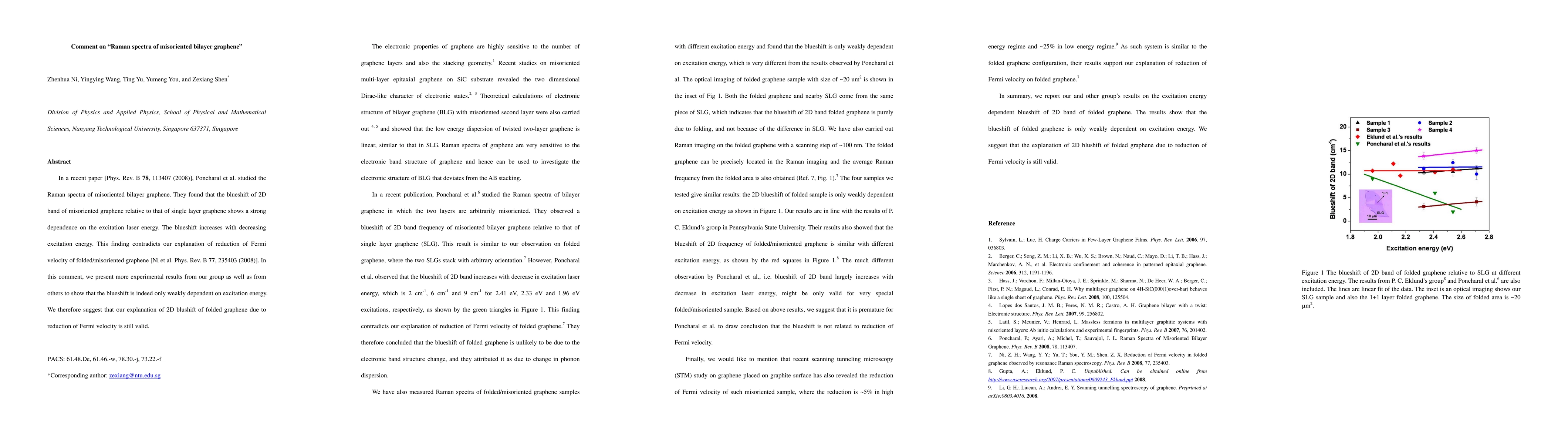 In a recent paper [Phys. Rev. B 78, 113407 (2008)], Poncharal et al. studied the Raman spectra of misoriented bilayer graphene. They found that the blueshift of 2D band of misoriented graphene relative to that of single layer graphene shows a strong dependence on the excitation laser energy. The blueshift increases with decreasing excitation energy. This finding contradicts our explanation of reduction of Fermi velocity of folded/misoriented graphene [Ni et al. Phys. Rev. B 77, 235403 (2008)]. In this comment, we present more experimental results from our group as well as from others to show that the blueshift is indeed only weakly dependent on excitation energy. We therefore suggest that our explanation of 2D blushift of folded graphene due to reduction of Fermi velocity is still valid.