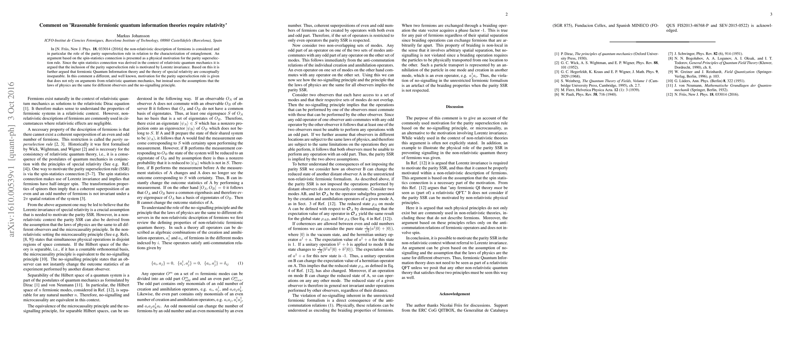 In [N. Friis, New J. Phys. 18, 033014 (2016)] the non-relativistic description of fermions is considered and in particular the role of the parity superselection rule in relation to the characterization of entanglement. An argument based on the spin-statistics connection is presented as a physical motivation for the parity superselection rule. Since the spin statistics connection was derived in the context of relativistic quantum mechanics it is argued that the inclusion of the parity superselection rule is motivated by Lorentz invariance. Based on this it is further argued that fermionic Quantum Information theory and the theory of special relativity are conceptually inseparable. In this comment a different, and well known, motivation for the parity superselection rule is given that does not rely on arguments from relativistic quantum mechanics, but instead uses the assumptions that the laws of physics are the same for different observers and the no-signalling principle.