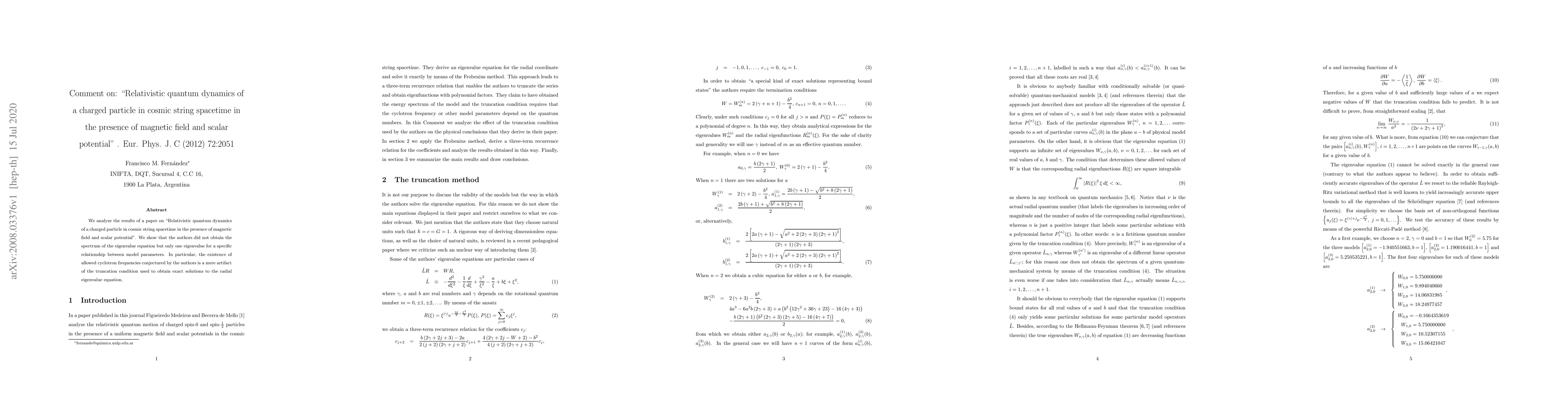 This paper critiques a previous study on relativistic quantum dynamics of a charged particle in cosmic string spacetime, highlighting that the authors only found one eigenvalue under specific conditions rather than the full spectrum. It argues that the proposed cyclotron frequencies are a result of the chosen truncation method, not a general finding.