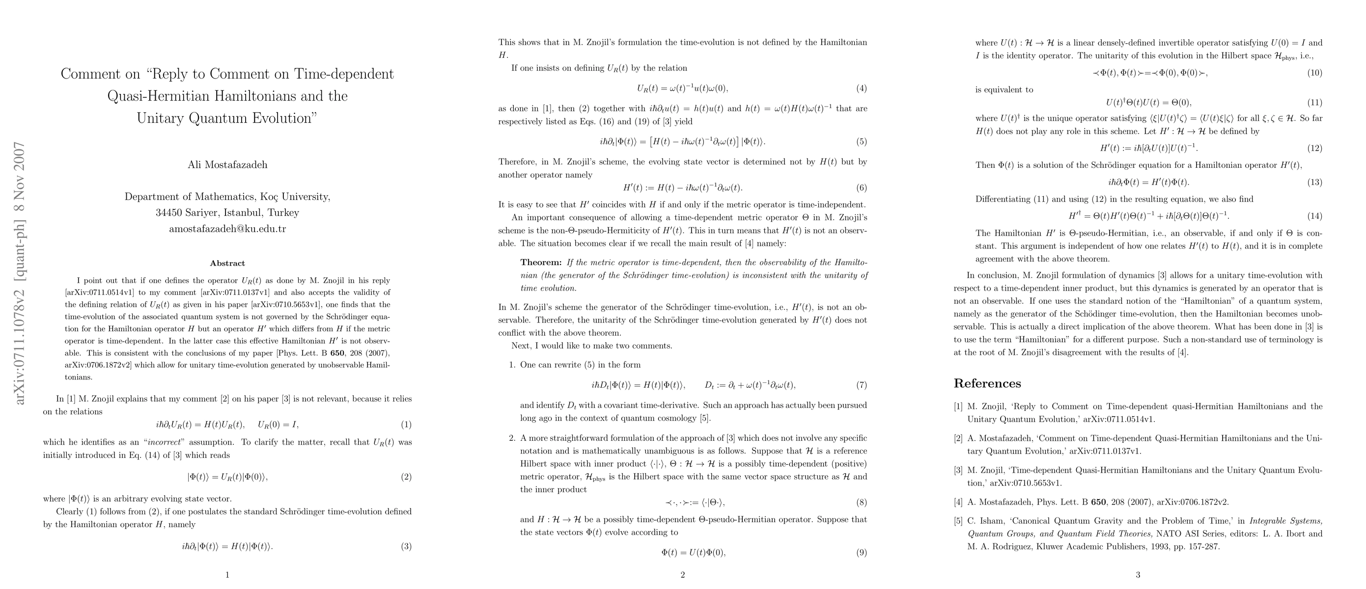 I point out that if one defines the operator $U_R(t)$ as done by M. Znojil in his reply [arXiv:0711.0514v1] to my comment [arXiv:0711.0137v1] and also accepts the validity of the defining relation of $U_R(t)$ as given in his paper [arXiv:0710.5653v1], one finds that the time-evolution of the associated quantum system is not governed by the Schr\"odinger equation for the Hamiltonian operator $H$ but an operator $H'$ which differs from $H$ if the metric operator is time-dependent. In the latter case this effective Hamiltonian $H'$ is not observable. This is consistent with the conclusions of my paper [Phys. Lett. B 650, 208 (2007), arXiv:0706.1872v2] which allow for unitary time-evolution generated by unobservable Hamiltonians.