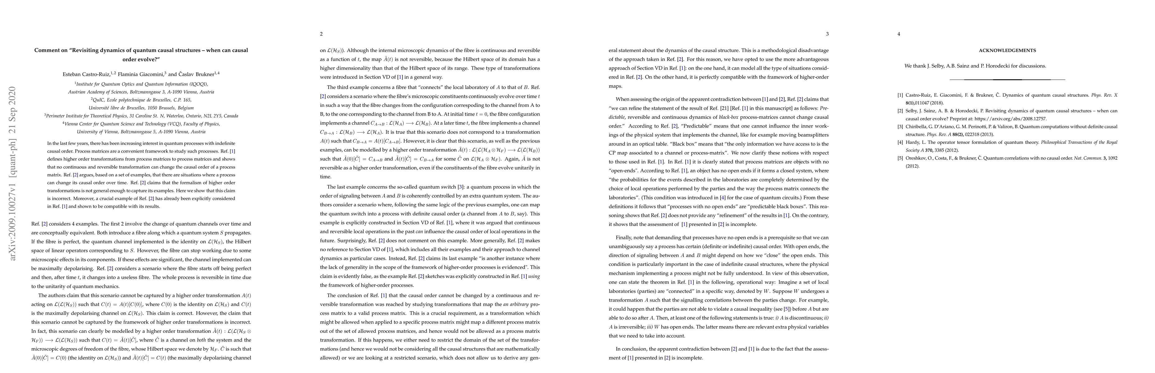 In the last few years, there has been increasing interest in quantum processes with indefinite causal order. Process matrices are a convenient framework to study such processes. Ref. [1] defines higher order transformations from process matrices to process matrices and shows that no continuous and reversible transformation can change the causal order of a process matrix. Ref. [2] argues, based on a set of examples, that there are situations where a process can change its causal order over time. Ref. [2] claims that the formalism of higher order transformations is not general enough to capture its examples. Here we show that this claim is incorrect. Moreover, a crucial example of Ref. [2] has already been explicitly considered in Ref. [1] and shown to be compatible with its results.