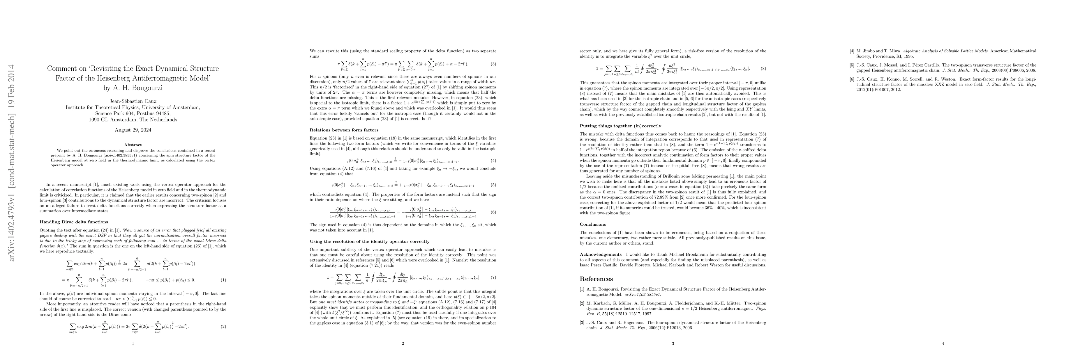 We point out the erroneous reasoning and disprove the conclusions contained in a recent preprint by A. H. Bougourzi (arxiv:1402.3855v1) concerning the spin structure factor of the Heisenberg model at zero field in the thermodynamic limit, as calculated using the vertex operator approach.