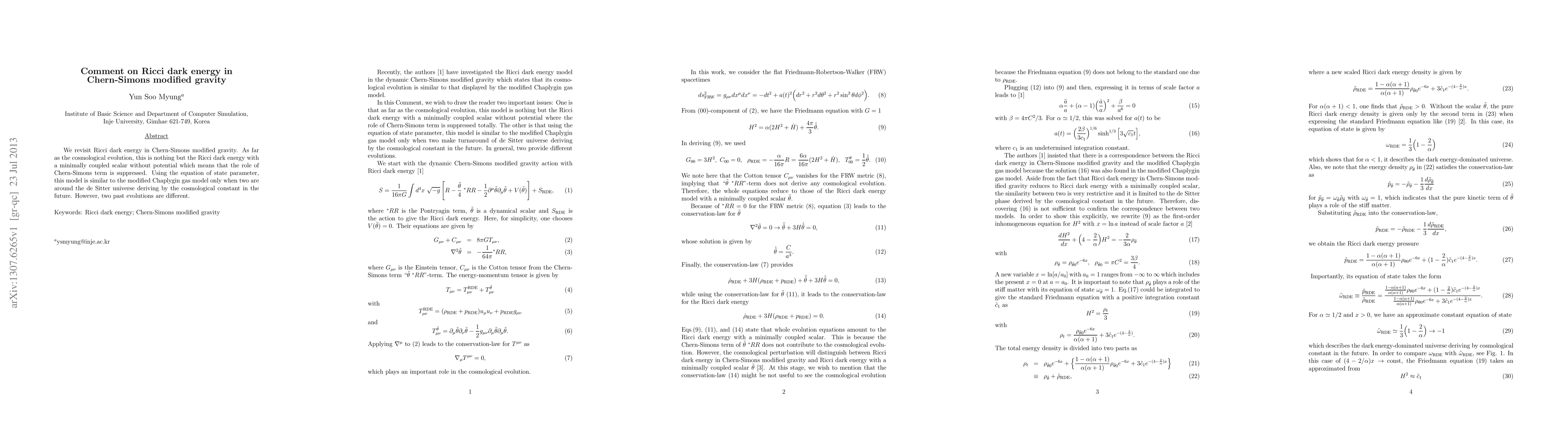We revisit Ricci dark energy in Chern-Simons modified gravity. As far as the cosmological evolution, this is nothing but the Ricci dark energy with a minimally coupled scalar without potential which means that the role of Chern-Simons term is suppressed. Using the equation of state parameter, this model is similar to the modified Chaplygin gas model only when two are around the de Sitter universe deriving by the cosmological constant in the future. However, two past evolutions are different.