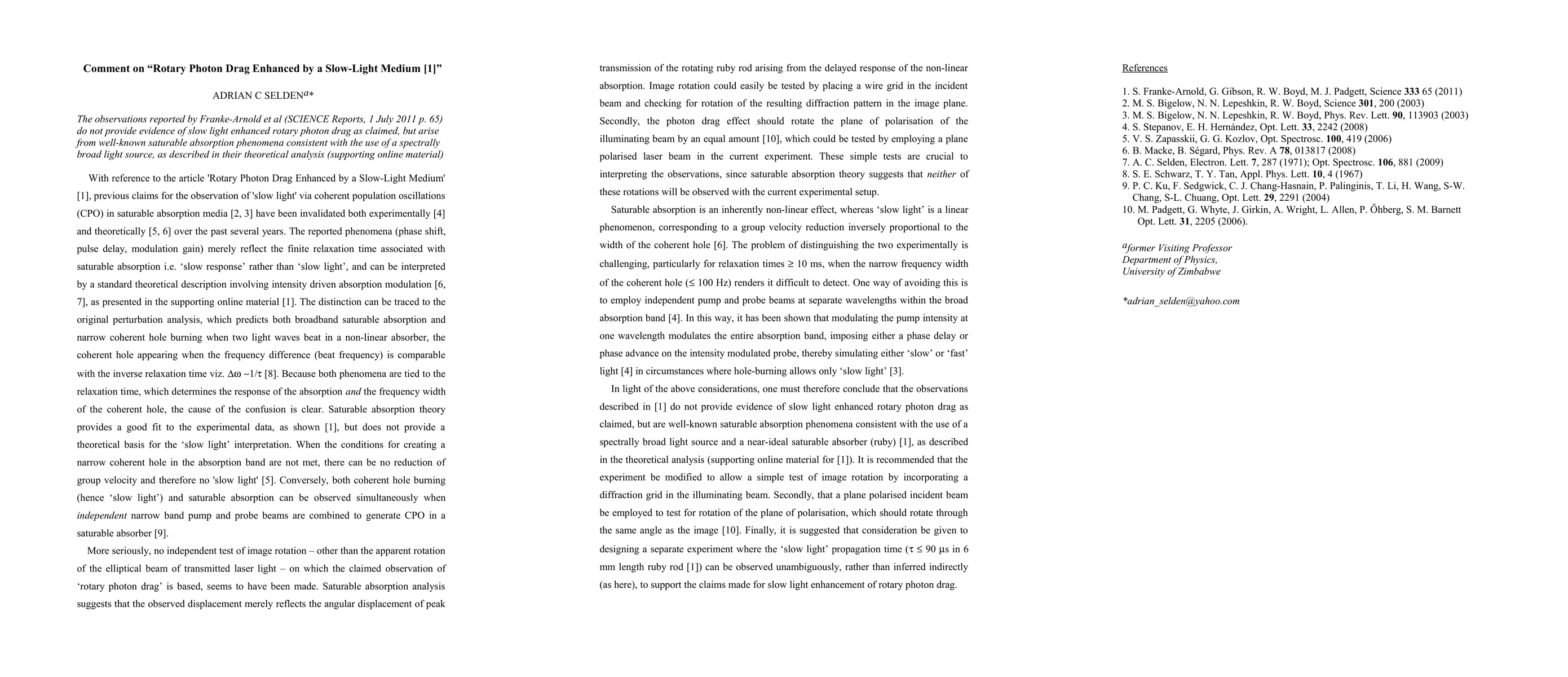 The observations reported by Franke-Arnold et al (SCIENCE Reports, 1 July 2011 p. 65) do not provide evidence of slow light enhanced rotary photon drag as claimed, but arise from well-known saturable absorption phenomena consistent with the use of a spectrally broad light source, as described in their theoretical analysis (supporting online material)