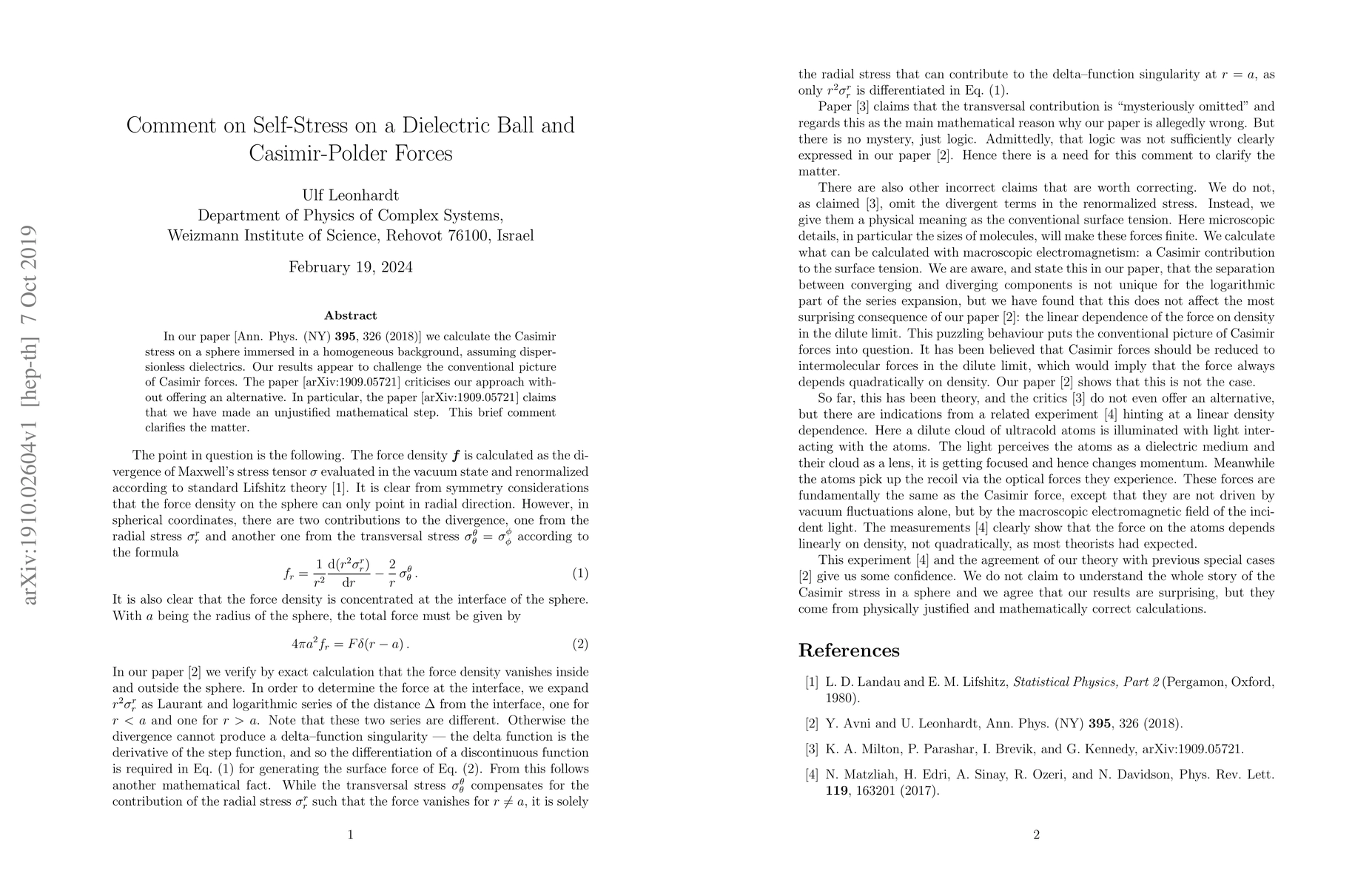 The comment clarifies previous work in [Ann. Phys. (NY) 395, 326 (2018)] on Casimir stress calculation for a sphere in a dispersionless dielectric, addressing criticisms in [arXiv:1909.05721] and justifying the mathematical steps taken.