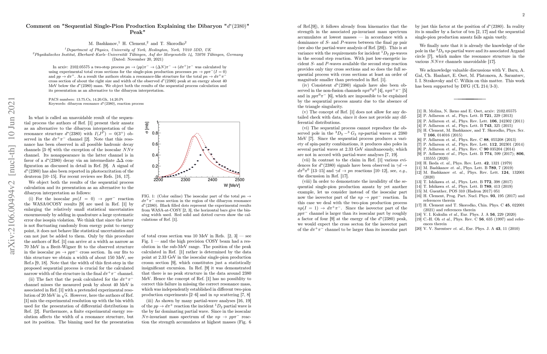 In arxiv: 2102.05575 a two-step process $pn \to (pp) \pi^- \to (\Delta N) \pi^- \to (d \pi^+) \pi^-$ was calculated by using experimental total cross sections for the single-pion production processes $pn \to pp \pi^-(I=0)$ and $pp \to d \pi^+$. As a result the authors obtain a resonance-like structure for the total $pn \to d\pi^+\pi^-$ cross section of about the right size and width of the observed $d^*(2380)$ peak at an energy about 40 MeV below the $d^*(2380)$ mass. We object both the results of the sequential process calculation and its presentation as an alternative to the dibaryon interpretation.