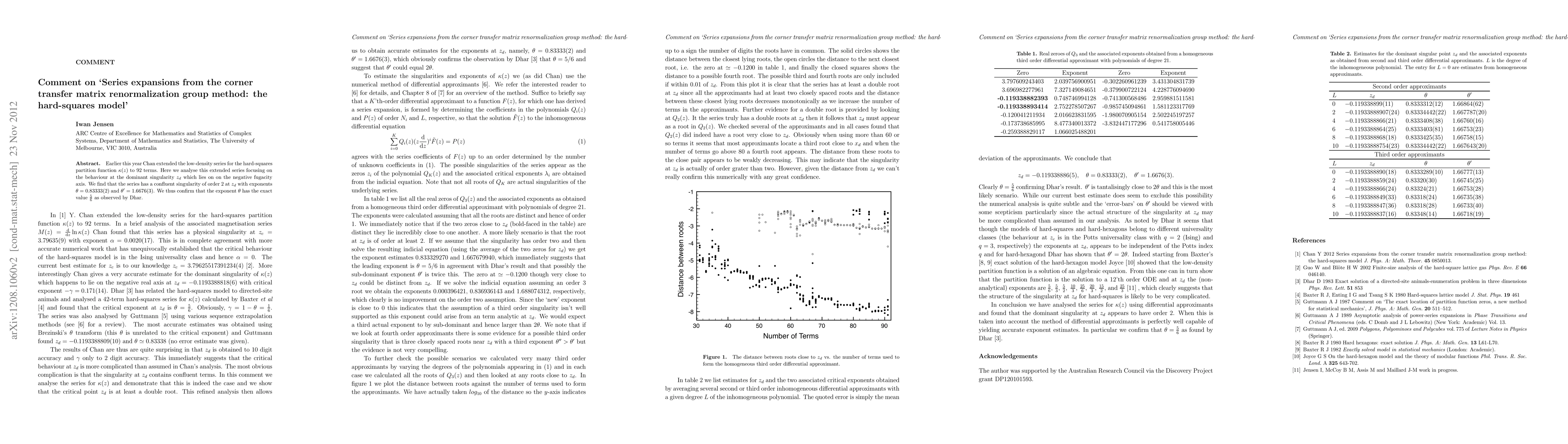 Earlier this year Chan extended the low-density series for the hard-squares partition function $\kappa(z)$ to 92 terms. Here we analyse this extended series focusing on the behaviour at the dominant singularity $z_d$ which lies on on the negative fugacity axis. We find that the series has a confluent singularity of order 2 at $z_d$ with exponents $\theta=0.83333(2)$ and $\theta'= 1.6676(3)$. We thus confirm that the exponent $\theta$ has the exact value $\frac56$ as observed by Dhar.