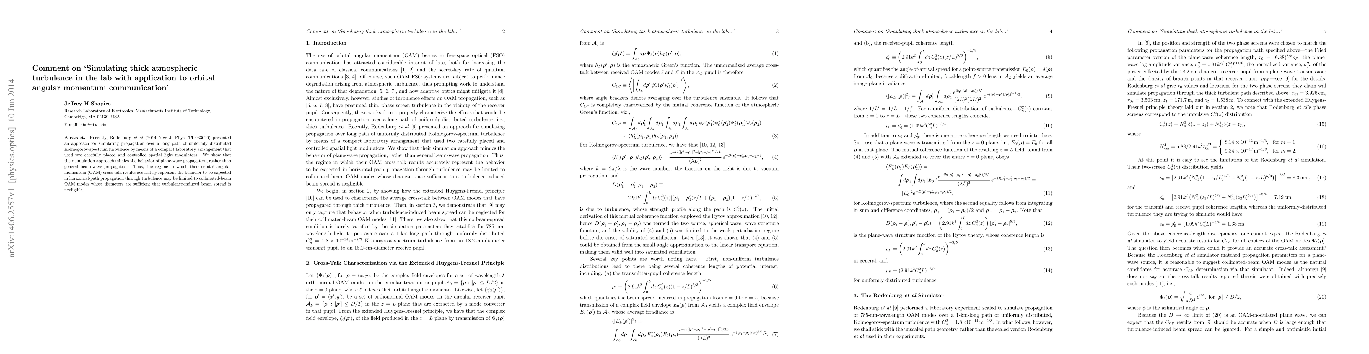 Recently, Rodenburg et al (2014 New J. Phys. 16 033020) presented an approach for simulating propagation over a long path of uniformly distributed Kolmogorov-spectrum turbulence by means of a compact laboratory arrangement that used two carefully placed and controlled spatial light modulators. We show that their simulation approach mimics the behavior of plane-wave propagation, rather than general beam-wave propagation. Thus, the regime in which their orbital angular momentum (OAM) cross-talk results accurately represent the behavior to be expected in horizontal-path propagation through turbulence may be limited to collimated-beam OAM modes whose diameters are sufficient that turbulence-induced beam spread is negligible.