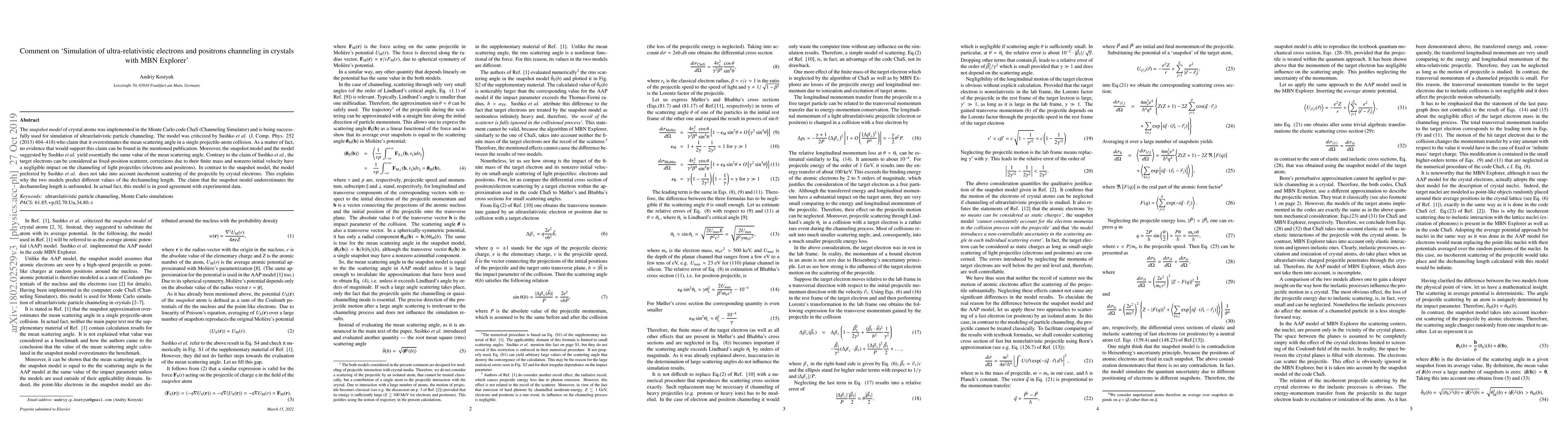 The snapshot model of crystal atoms was implemented in the Monte Carlo code ChaS (Channeling Simulator) and is being successfully used for simulation of ultrarelativistic particle channeling. The model was criticized by Sushko et al. (J. Comp. Phys. 252 (2013) 404-418) who claim that it overestimates the mean scattering angle in a single projectile-atom collision. As a matter of fact, no evidence that would support this claim can be found in the mentioned publication. Moreover, the snapshot model and the model suggested by Sushko et al. yield essentially the same value of the mean scattering angle. Contrary to the claim of Sushko et al., the target electrons can be considered as fixed-position scatterer, corrections due to their finite mass and nonzero initial velocity have a negligible impact on the channeling of light projectiles (electrons and positrons). In contrast to the snapshot model, the model preferred by Sushko et al. does not take into account incoherent scattering of the projectile by crystal electrons. This explains why the two models predict different values of the dechanneling length. The claim that the snapshot model underestimates the dechanneling length is unfounded. In actual fact, this model is in good agreement with experimental data.