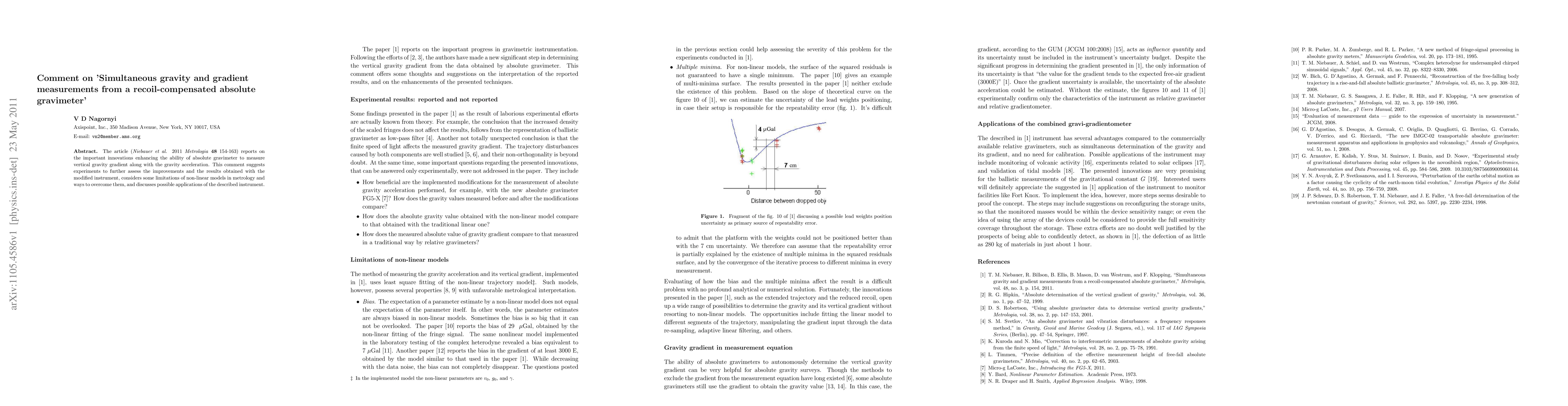 The article (Niebauer et al. 2011 Metrologia 48 154-163) reports on the important innovations enhancing the ability of absolute gravimeter to measure vertical gravity gradient along with the gravity acceleration. This comment suggests experiments to further assess the improvements and the results obtained with the modified instrument, considers some limitations of non-linear models in metrology and ways to overcome them, and discusses possible applications of the described instrument.