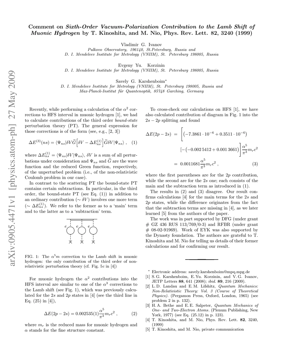 This comment identifies an overlooked $\alpha^3$ correction term in the sixth-order vacuum-polarization contribution to the Lamb shift in muonic hydrogen, originally calculated by Kinoshita and Nio in 1999. The authors emphasize the importance of this additional term for accurate theoretical predictions.