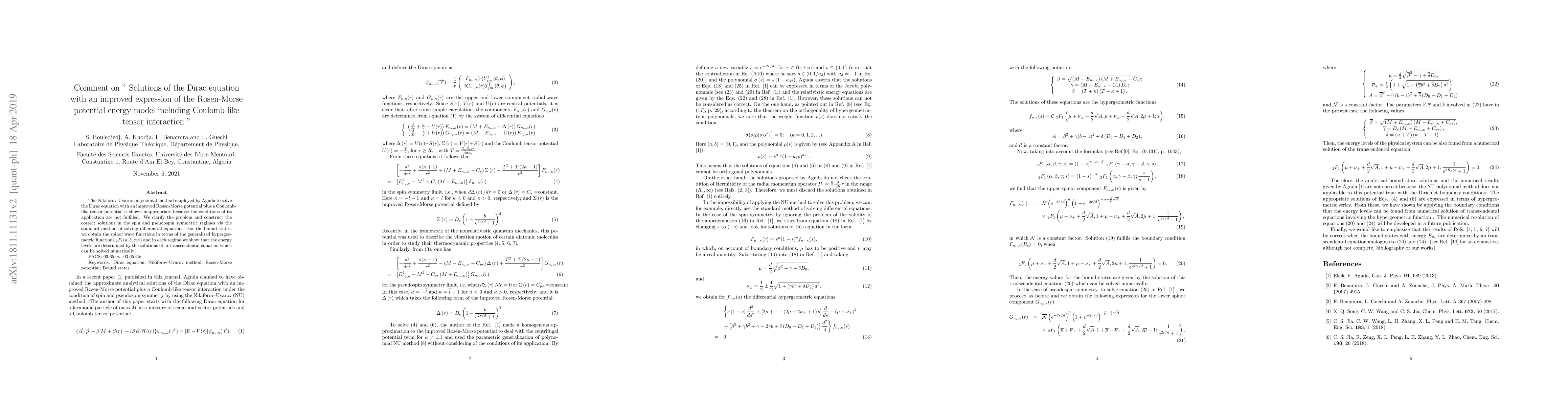 The Nikiforov-Uvarov polynomial method employed by Aguda to solve the Dirac equation with an improved Rosen-Morse potential plus a Coulomb-like tensor potential is shown inappropriate because the conditions of its application are not fulfilled. We clarify the problem and construct the correct solutions in the spin and pseudospin symmetric regimes via the standard method of solving differential equations. For the bound states, we obtain the spinor wave functions in terms of the generalized hypergeometric functions and in each regime we show that the energy levels are determined by the solutions of a transcendental equation which can be solved numerically.
