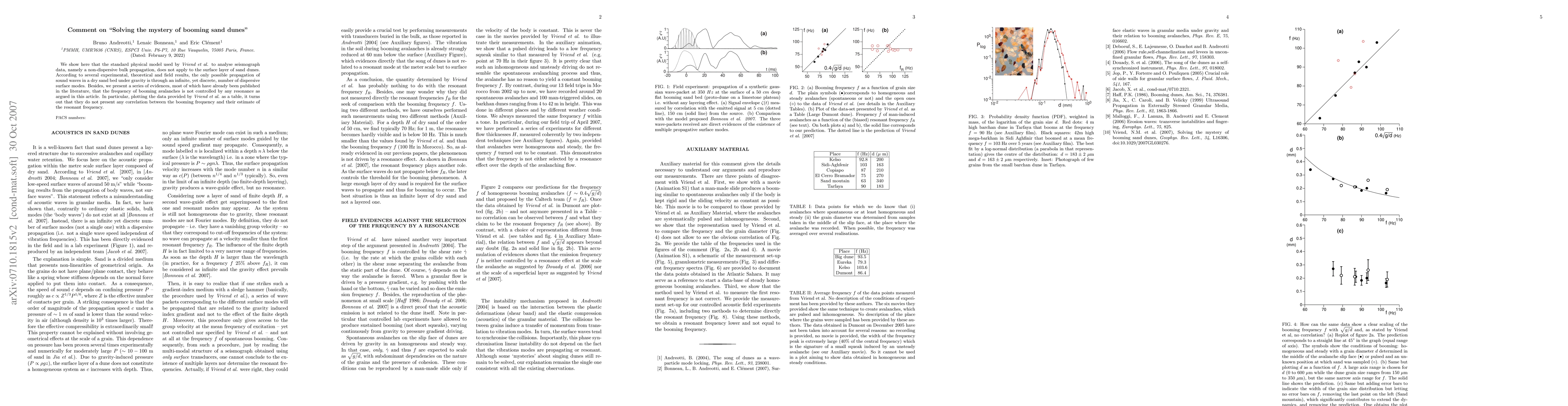 We show here that the standard physical model used by Vriend et al. to analyse seismograph data, namely a non-dispersive bulk propagation, does not apply to the surface layer of sand dunes. According to several experimental, theoretical and field results, the only possible propagation of sound waves in a dry sand bed under gravity is through an infinite, yet discrete, number of dispersive surface modes. Besides, we present a series of evidences, most of which have already been published in the literature, that the frequency of booming avalanches is not controlled by any resonance as argued in this article. In particular, plotting the data provided by Vriend et al. as a table, it turns out that they do not present any correlation between the booming frequency and their estimate of the resonant frequency.