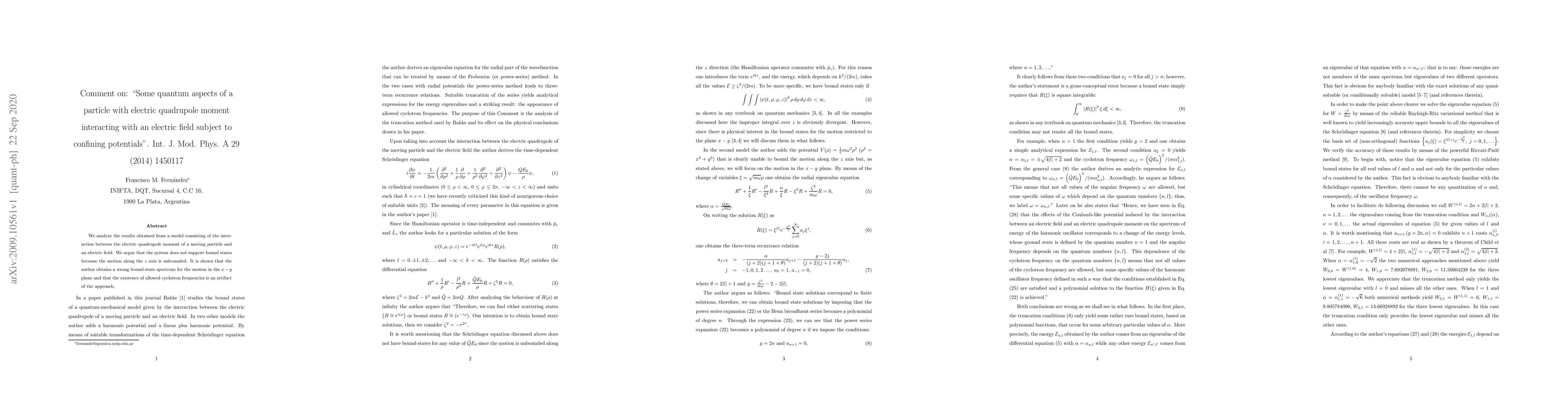 We analyze the results obtained from a model consisting of the interaction etween the electric quadrupole moment of a moving particle and an electric field. We argue that the system does not support bound states because the motion along the $z$ axis is unbounded. It is shown that the author obtains a wrong bound-state spectrum for the motion in the $x-y$ plane and that the existence of allowed cyclotron frequencies is an artifact of the approach.