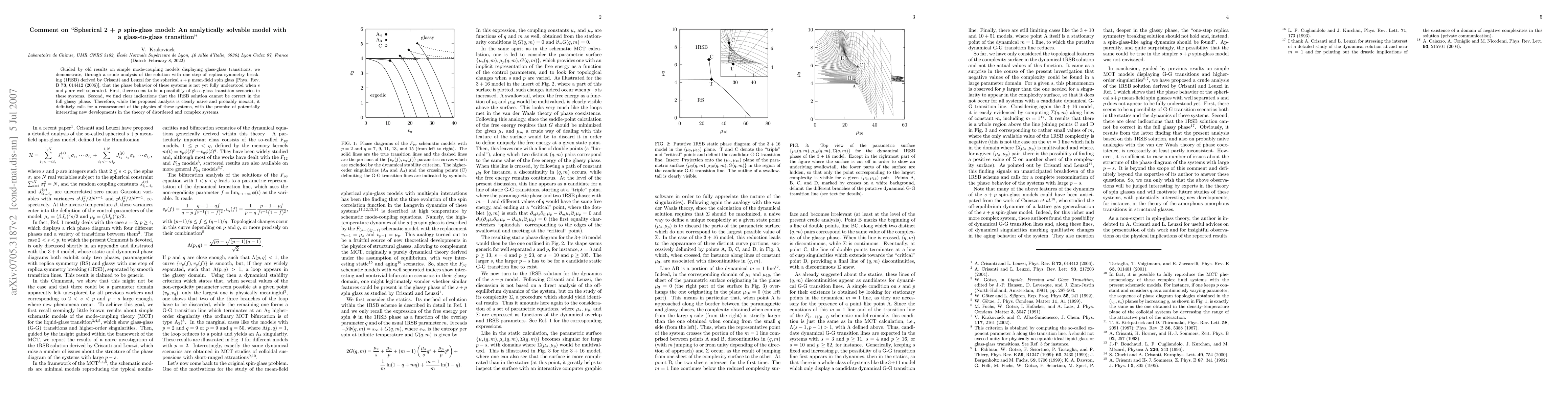 This paper critiques the 1RSB solution for the spherical $s+p$ spin-glass model, suggesting that the phase behavior remains unclear, especially when $s$ and $p$ are significantly different. It proposes a potential glass-glass transition and questions the validity of the 1RSB solution in the full glassy phase, calling for a reevaluation of the theoretical understanding of these systems.