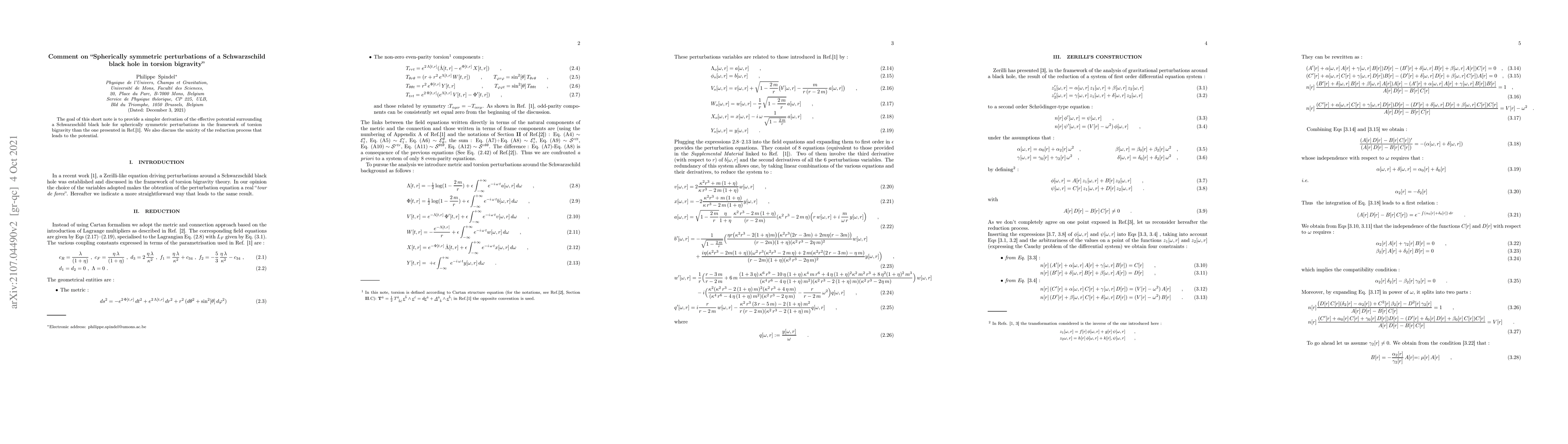 The goal of this short note is to provide a simpler derivation of the effective potential surrounding a Schwarzschild black hole for spherically symmetric perturbations in the framework of torsion bigravity than the one presented in [V. Nikiforova, Spherically symmetric perturbations of a Schwarzschild black hole in torsion bigravity, Phys. Rev. D 104, 024032 (2021).]. We also discuss the unicity of the reduction process that leads to the potential.