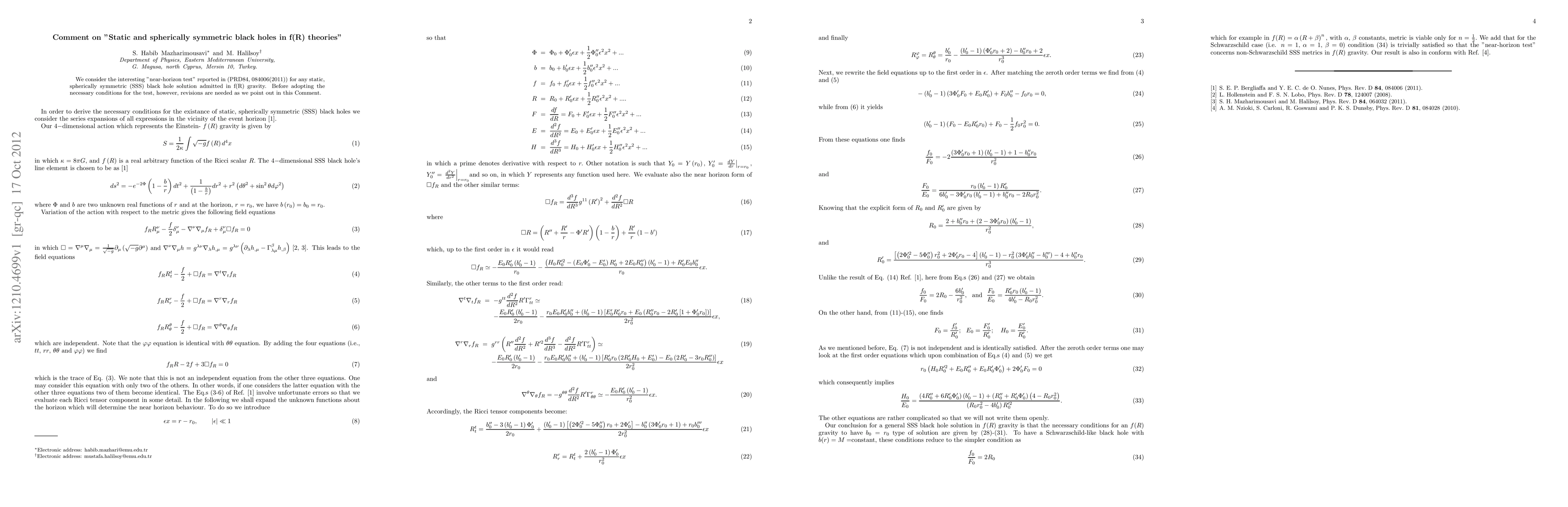 This Comment addresses the "near-horizon test" for static, spherically symmetric black holes in f(R) gravity, highlighting necessary revisions before adopting the conditions reported in a previous study. The paper aims to correct and refine the test's criteria.