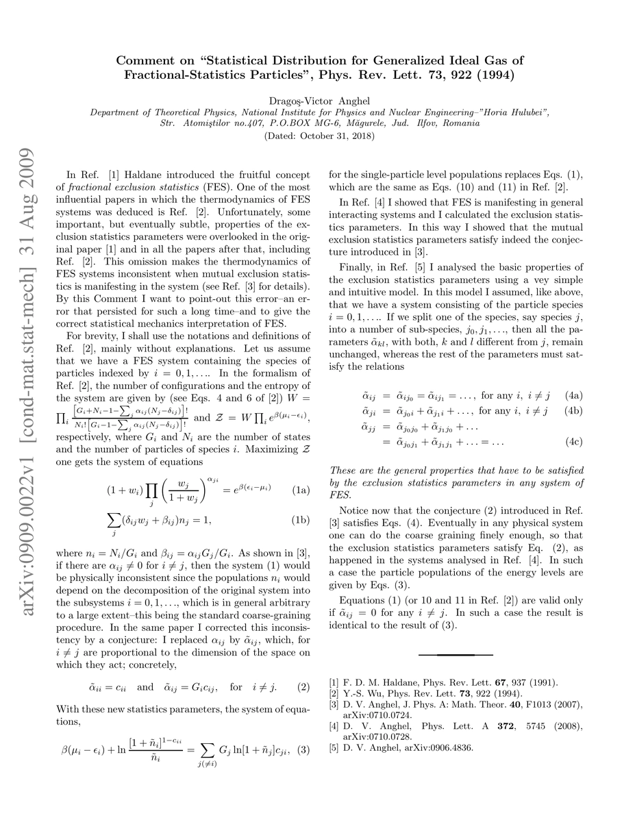 This comment addresses an overlooked inconsistency in the thermodynamics of systems with fractional exclusion statistics (FES), originally introduced by Haldane and further explored by Wu. It highlights the persistent error in the interpretation of exclusion statistics parameters and provides the correct statistical mechanics framework for FES systems.