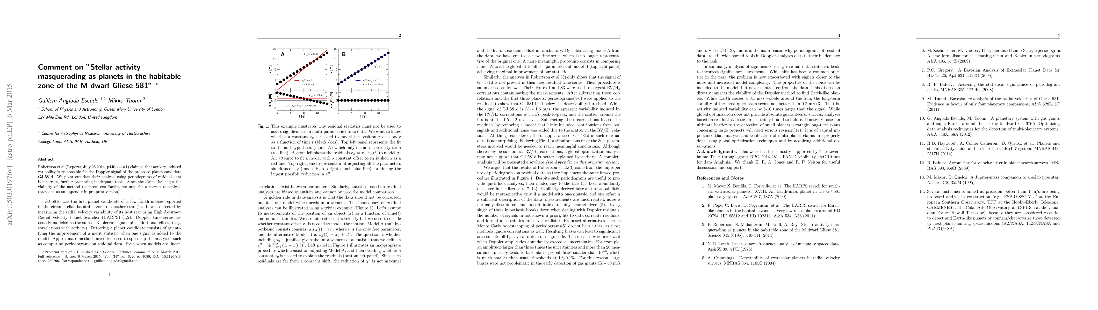 Robertson et al.(Reports, July 25 2014, p440-444)(1) claimed that activity-induced variability is responsible for the Doppler signal of the proposed planet candidate GJ 581d. We point out that their analysis using periodograms of residual data is incorrect, further promoting inadequate tools. Since the claim challenges the viability of the method to detect exo-Earths, we urge for more appropriate analyses (see appendix).