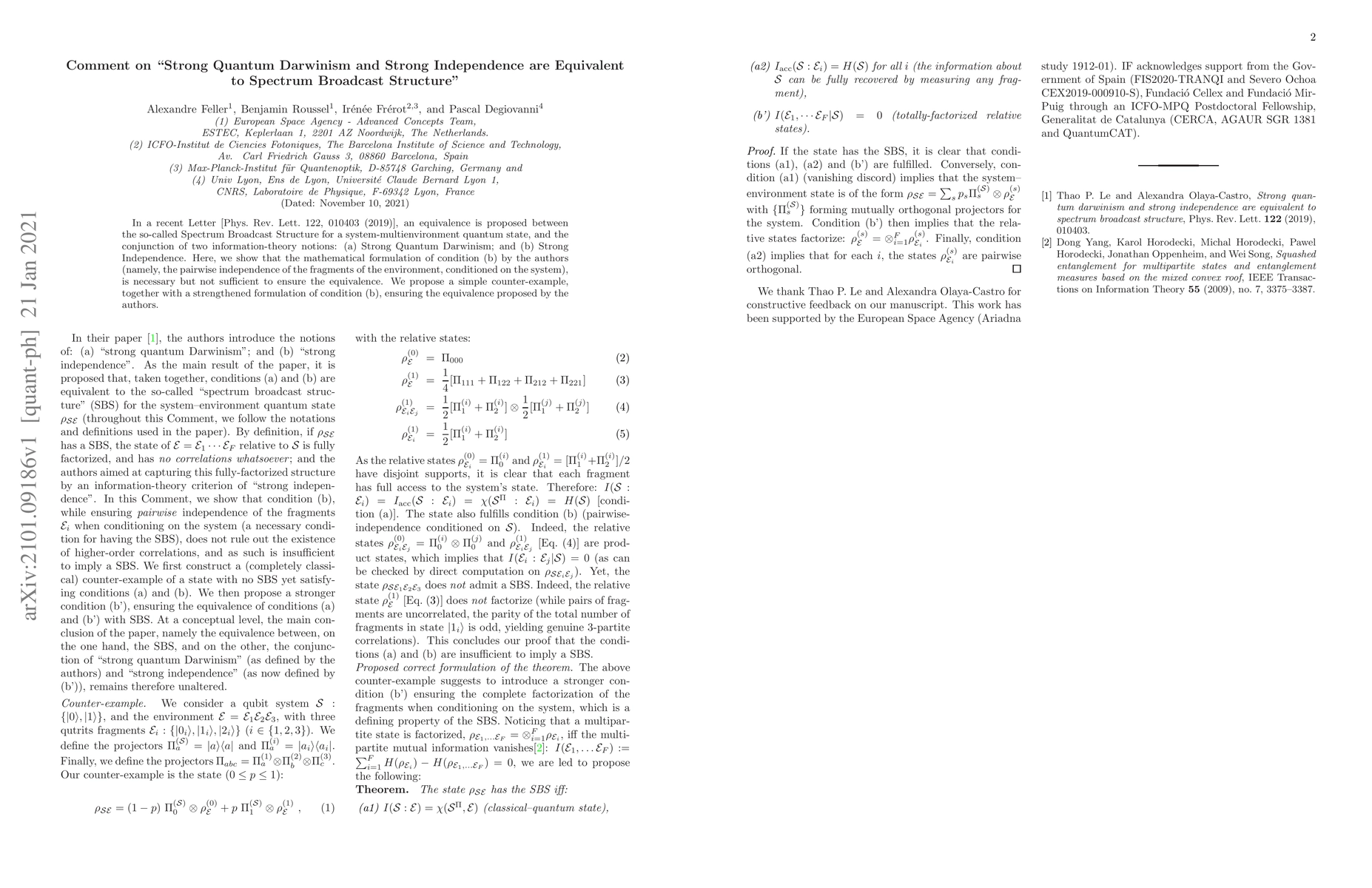 In a recent Letter [Phys. Rev. Lett. 122, 010403 (2019)], an equivalence is proposed between the so-called Spectrum Broadcast Structure for a system-multienvironment quantum state, and the conjunction of two information-theory notions: (a) Strong Quantum Darwinism; and (b) Strong Independence. Here, we show that the mathematical formulation of condition (b) by the authors (namely, the pairwise independence of the fragments of the environment, conditioned on the system), is necessary but not sufficient to ensure the equivalence. We propose a simple counter-example, together with a strengthened formulation of condition (b), ensuring the equivalence proposed by the authors.