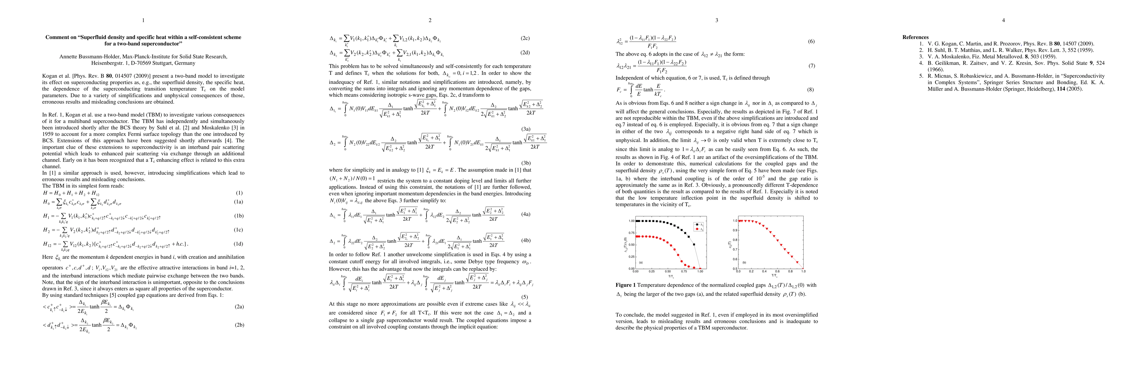 Kogan et al. [Phys. Rev. B 80, 014507 (2009)] present a two-band model to investigate its effect on superconducting properties as, e.g., the superfluid density, the specific heat, the dependence of the superconducting transition temperature Tc on the model parameters. Due to a variety of simplifications and unphysical consequences of those, erroneous results and misleading conclusions are obtained.