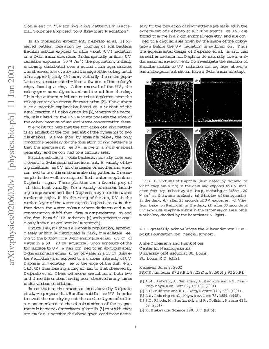 Commenting on the paper "Swarming Ring Patterns in Bacterial Colonies Exposed to Ultraviolet Radiation" of A.M. Delprato et al., Phys. Rev. Lett 87, 158102 (2001) we point out that their observed ring pattern formation by colonies of soil bacteria Bacillus subtilis exposed to ultra violet (UV) radiation might be caused by the artificial confinement of motile bacteria evolved to live in a 3-dimensional environment to a 2-dimensional geometry. We propose that to investigate the reaction of Bacillus subtilis to UV radiation coming from above, a seminal experiment should have a 3-dimensional setup.