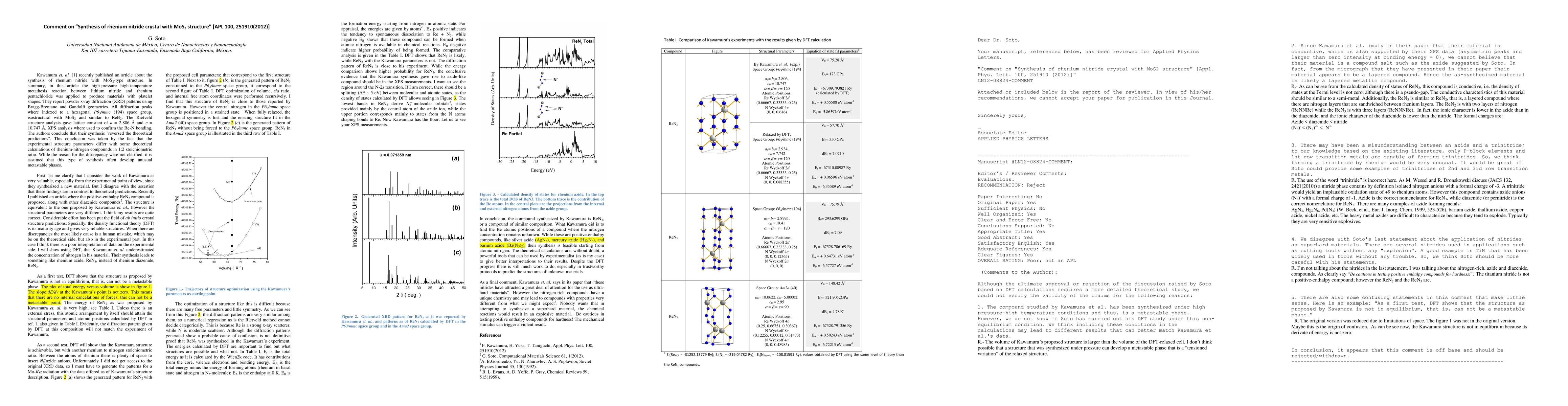 Kawamura et. al. recently published an article about the synthesis of rhenium nitride with MoS2-type structure [APL 100, 251910(2012)]. We disagree with the composition proposed by Kawamura. The compound synthesized by Kawamura is ReN3, or a compound of similar composition. What Kawamura did is to find the Re atomic positions of a compound where the nitrogen concentration remains unknown. This paper was rejected form APL. The reviewer comments (and our reply) are included here.