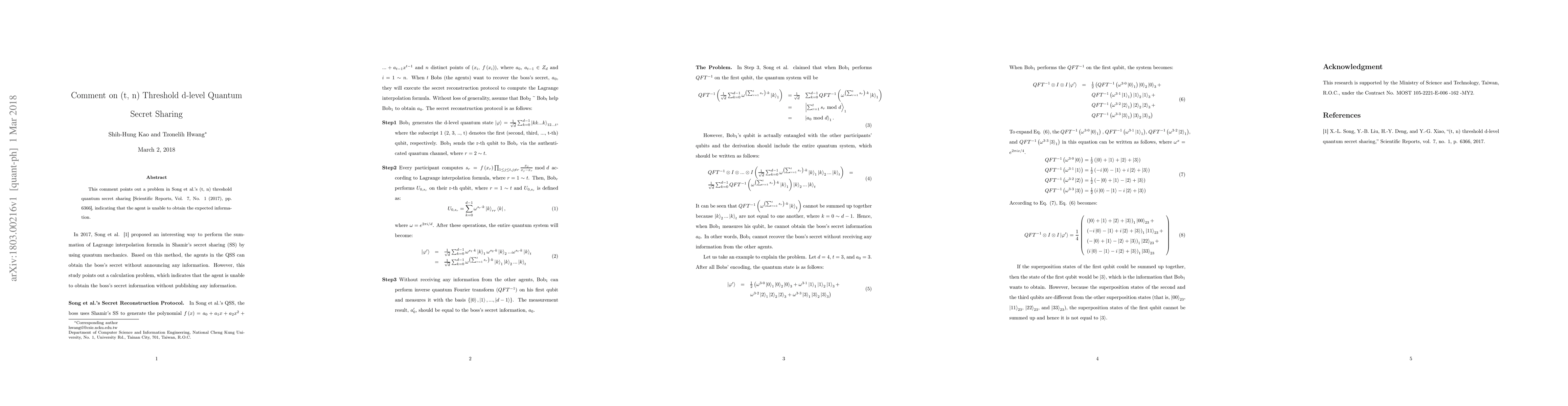 This comment points out a problem in Song et al.'s (t, n) threshold quantum secret sharing [Scientific Reports, Vol. 7, No. 1 (2017), pp. 6366], indicating that the agent is unable to obtain the expected information.