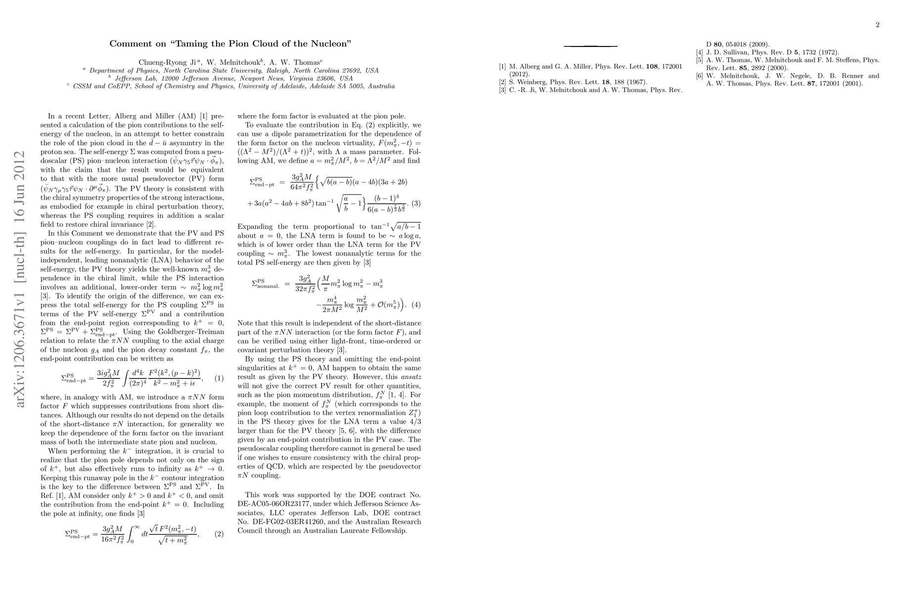 In a recent Letter, Alberg and Miller presented a calculation of the pion contributions to the self-energy of the nucleon computed from a pseudoscalar (PS) pion-nucleon interaction, with the claim that the result would be equivalent to that with the pseudovector (PV) form. We demonstrate that the PV and PS pion-nucleon couplings do in fact lead to different results for the self-energy. In particular, for the model-independent, leading nonanalytic behavior of the self-energy, the PV theory yields the well-known m_\pi^3 dependence in the chiral limit, while the PS interaction involves an additional, lower-order term ~ m_\pi^2 log(m_\pi^2).
