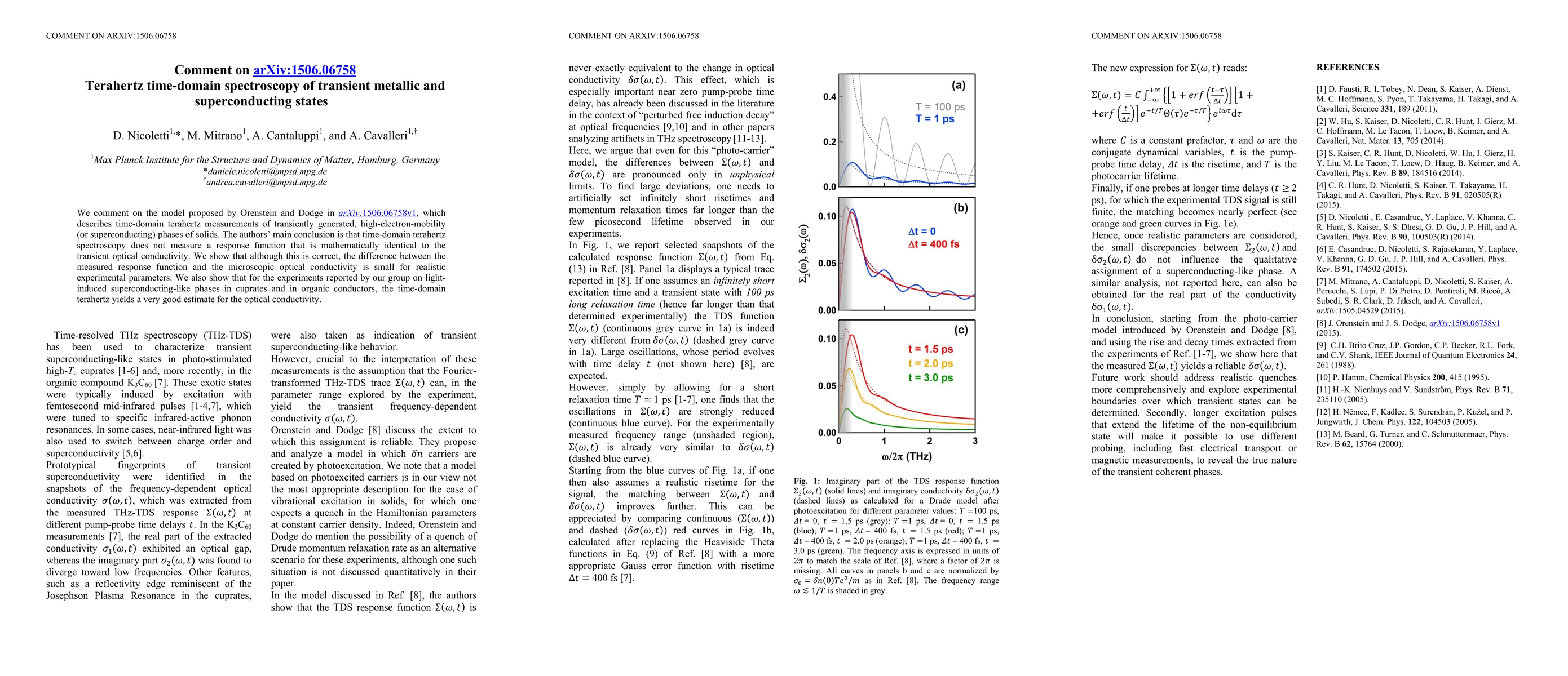 This paper critiques the model proposed by Orenstein and Dodge regarding terahertz time-domain spectroscopy of transient metallic and superconducting states, arguing that the difference between the measured response function and the microscopic optical conductivity is minimal under realistic experimental conditions. The authors also validate their findings with their own experiments on light-induced superconducting-like phases in cuprates and organic conductors.