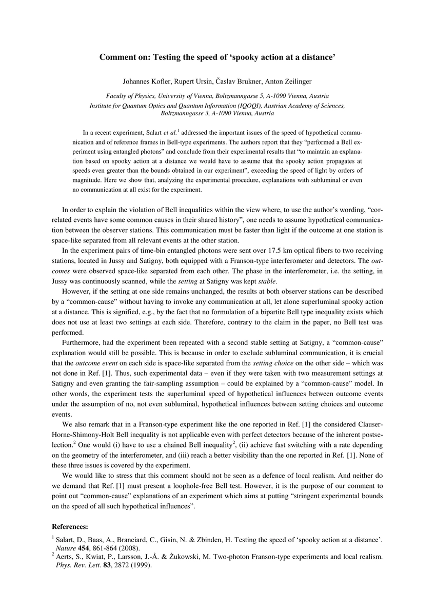 This paper critiques Salart et al.'s Bell experiment, arguing that their conclusion about "spooky action at a distance" exceeding the speed of light is not definitive. The authors propose alternative explanations that do not require superluminal communication.