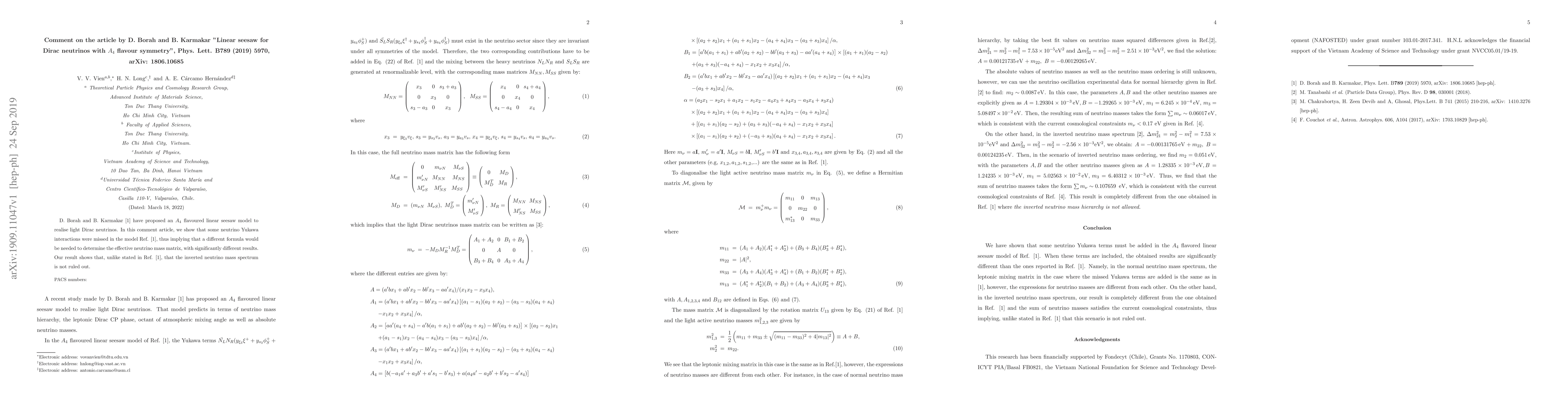 D. Borah and B. Karmakar in Phys. Lett. B789 (2019) have proposed an A4 flavoured linear seesaw model to realise light Dirac neutrinos. In this comment article, we show that some neutrino Yukawa interactions were missed in the model, thus implying that a different formula would be needed to determine the effective neutrino mass matrix, with significantly different results. Our result shows that, unlike stated in Phys. Lett. B789 (2019), that the inverted neutrino mass spectrum is not ruled out.