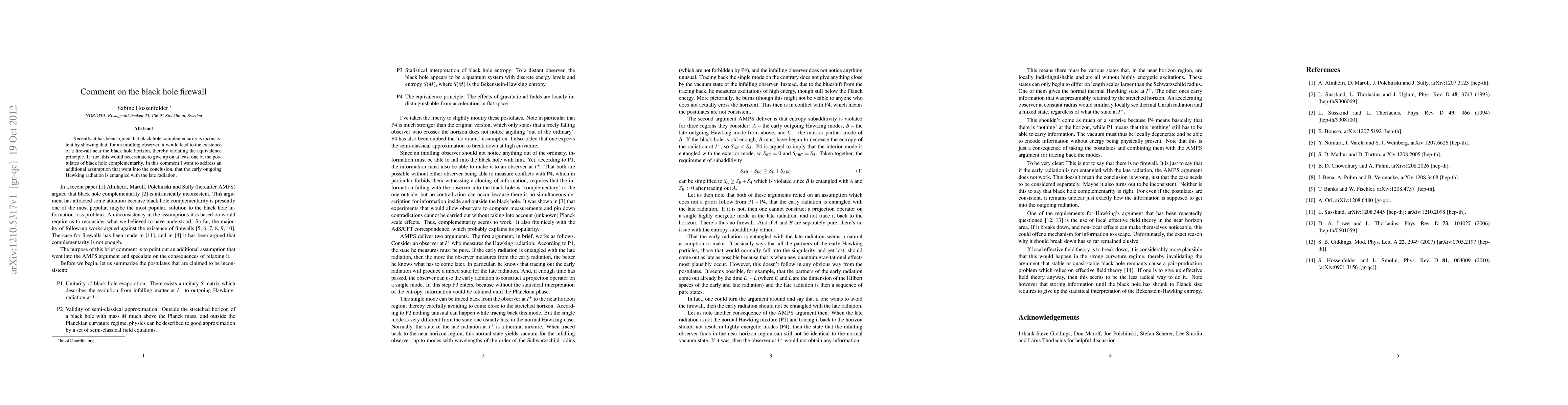 Recently, it has been argued that black hole complementarity is inconsistent by showing that, for an infalling observer, it would lead to the existence of a firewall near the black hole horizon, thereby violating the equivalence principle. If true, this would necessitate to give up on at least one of the postulates of black hole complementarity. In this comment I want to address an additional assumption that went into the conclusion, that the early outgoing Hawking radiation is entangled with the late radiation.
