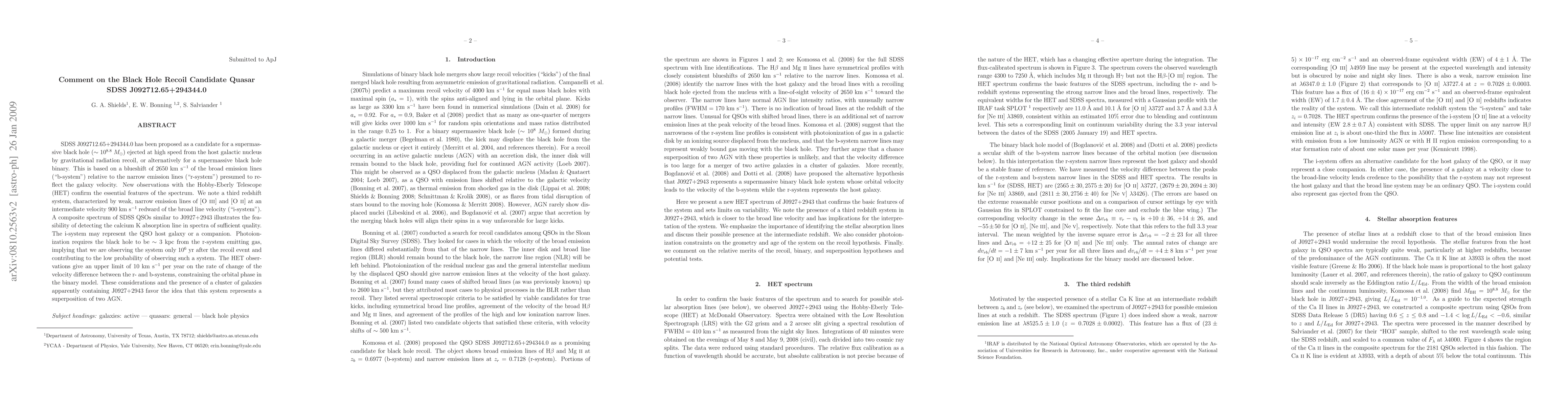 This paper discusses SDSS J092712.65+294344.0, a quasar proposed as a supermassive black hole candidate ejected by gravitational recoil or as part of a binary system. New observations confirm the blueshift and reveal a third redshift system, suggesting a superposition of two active galactic nuclei (AGN).