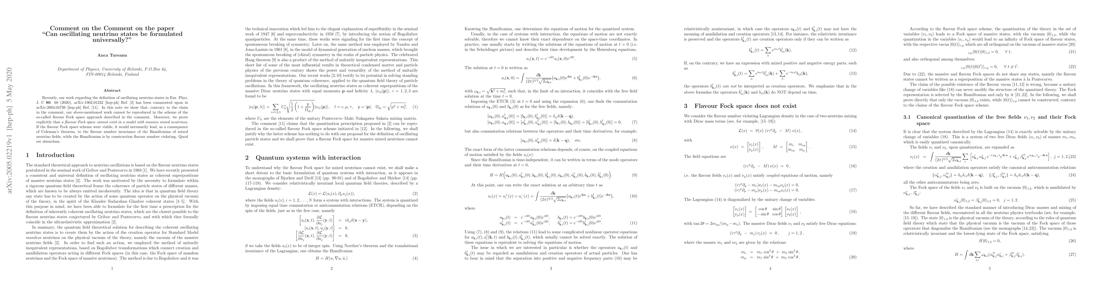 Recently, our work regarding the definition of oscillating neutrino states in Eur. Phys. J. C 80: 68 (2020), arxiv:1902.01232 [hep-ph] has been commented upon in arXiv:2004.04739 [hep-ph]. In this note we show that, contrary to the claim in the comment, our above-mentioned work cannot be reproduced in the scheme of the so-called flavour Fock space approach described in the comment. Moreover, we prove explicitly that a flavour Fock space cannot exist in a model with massive mixed neutrinos. If the flavour Fock space scheme were viable, it would necessarily lead, as a consequence of Coleman's theorem, to the flavour number invariance of the Hamiltonian of mixed neutrino fields, while the Hamiltonian is by construction flavour number violating. Quod est absurdum.