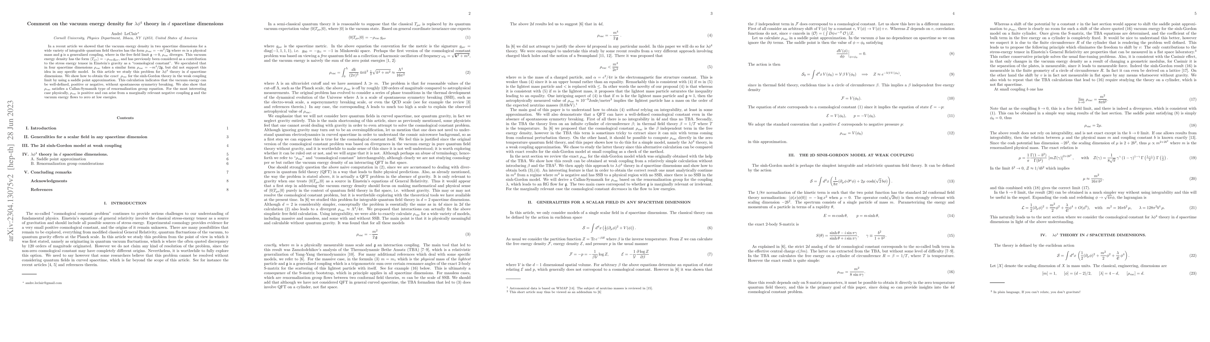 In a recent article we showed that the analog of the cosmological constant in two spacetime dimensions for a wide variety of integrable quantum field theories has the form $\rho_{\rm vac} = - m^2 /2 \mathfrak{g} $ where $m$ is a physical mass and $\mathfrak{g} $ is a generalized coupling, where in the free field limit $\mathfrak{g} \to 0$, $\rho_{\rm vac}$ diverges. We speculated that in four spacetime dimensions $\rho_{\rm vac} $ takes a similar form $\rho_{\rm vac} = - m^4/2 \mathfrak{g}$, but did not support this idea in any specific model. In this article we study this problem for $\lambda \phi^4$ theory in $d$ spacetime dimensions. We show how to obtain the exact $\rho_{\rm vac}$ for the sinh-Gordon theory in the weak coupling limit by using a saddle point approximation. This calculation indicates that the cosmological constant can be well-defined, positive or negative, without spontaneous symmetry breaking. We also show that $\rho_{\rm vac}$ satisfies a Callan-Symanzik type of renormalization group equation. For the most interesting case physically, $\rho_{\rm vac}$ is positive and can arise from a marginally relevant negative coupling $\mathfrak{g}$ and the cosmological constant flows to zero at low energies.
