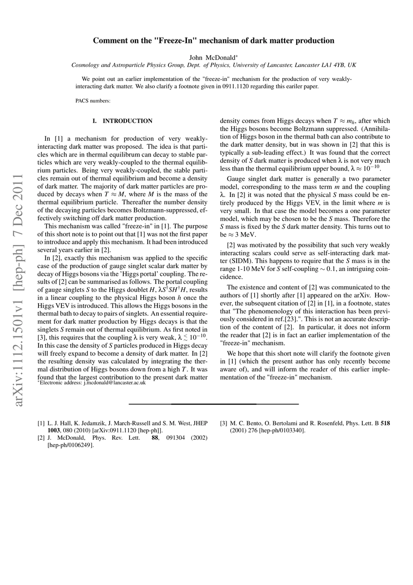 We point out an earlier implementation of the "freeze-in" mechanism for the production of very weakly-interacting dark matter. We also clarify a footnote given in 0911.1120 regarding this eariler paper.