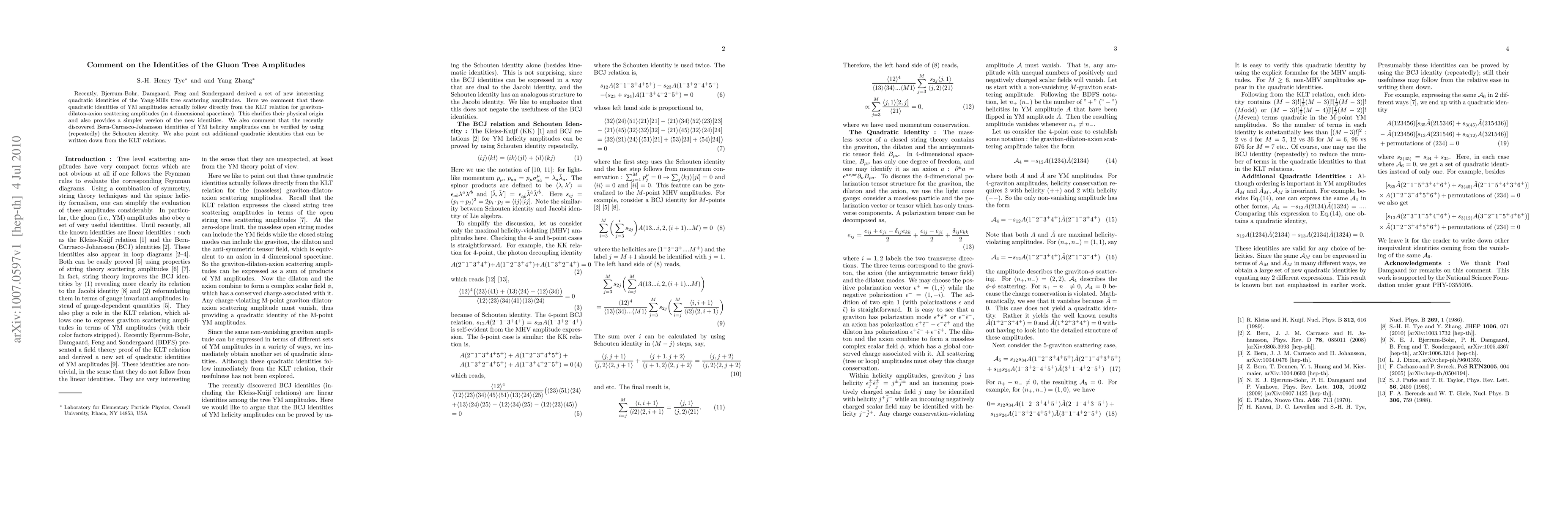 This paper discusses new quadratic identities in Yang-Mills tree scattering amplitudes derived by Bjerrum-Bohr et al., showing they follow from KLT relations for graviton-dilaton-axion amplitudes, providing a clearer physical origin and simpler versions of these identities. It also verifies Bern-Carrasco-Johansson identities using the Schouten identity and identifies additional quadratic identities from KLT relations.
