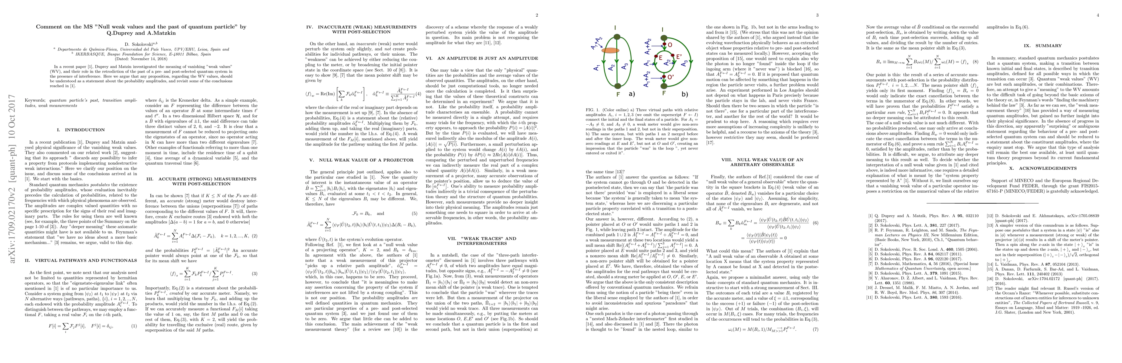 In a recent paper \cite{Matz}, Duprey and Matzin investigeated the meaning of vanishing "weak values" (WV), and their role in the retrodiction of the past of a pre- and post-selected quantum system in the presence of interference. Here we argue that any proposition, regarding the WV values, should be understood as a statement about the probability amplitudes, and revisit some of the conclusions reached in \cite{Matz}.