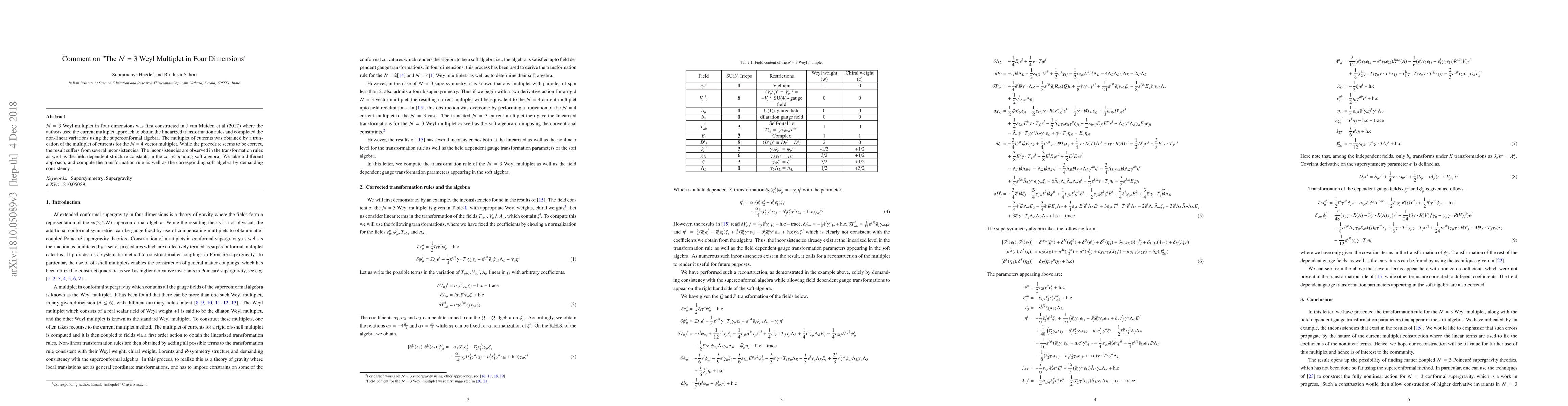 N = 3 Weyl multiplet in four dimensions was first constructed in J van Muiden et al (2017) where the authors used the current multiplet approach to obtain the linearized transformation rules and completed the nonlinear variations using the superconformal algebra. The multiplet of currents was obtained by a truncation of the multiplet of currents for the N = 4 vector multiplet. While the procedure seems to be correct, the result suffers from several inconsistencies. The inconsistencies are observed in the transformation rules as well as the field dependent structure constants in the corresponding soft algebra. We take a different approach, and compute the transformation rule as well as the corresponding soft algebra by demanding consistency.