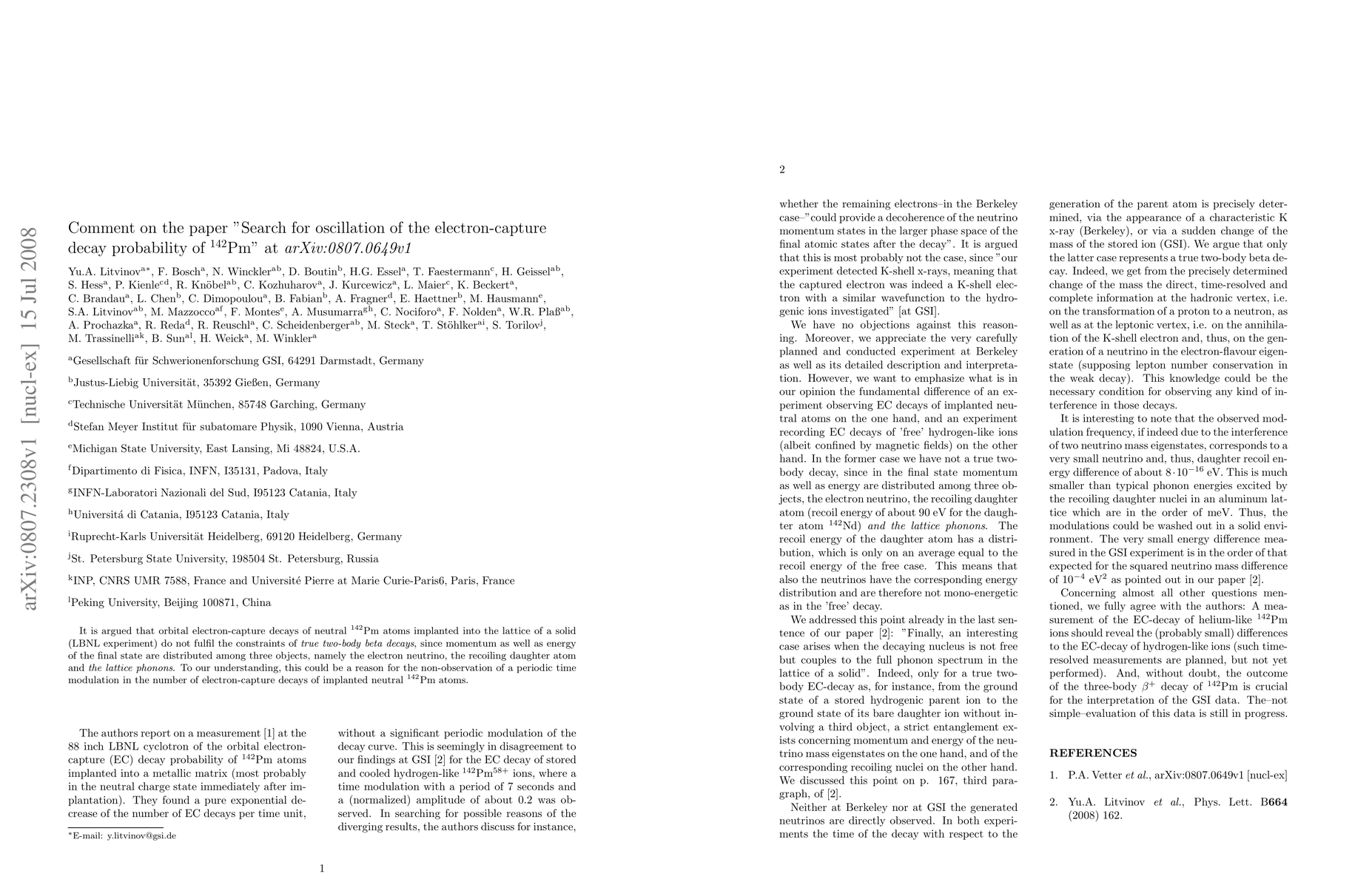 It is argued that orbital electron-capture decays of neutral $^{142}$Pm atoms implanted into the lattice of a solid (LBNL experiment) do not fulfil the constraints of true two-body beta decays, since momentum as well as energy of the final state are distributed among three objects, namely the electron neutrino, the recoiling daughter atom and the lattice phonons. To our understanding, this could be a reason for the non-observation of a periodic time modulation in the number of electron-capture decays of implanted neutral $^{142}$Pm atoms.