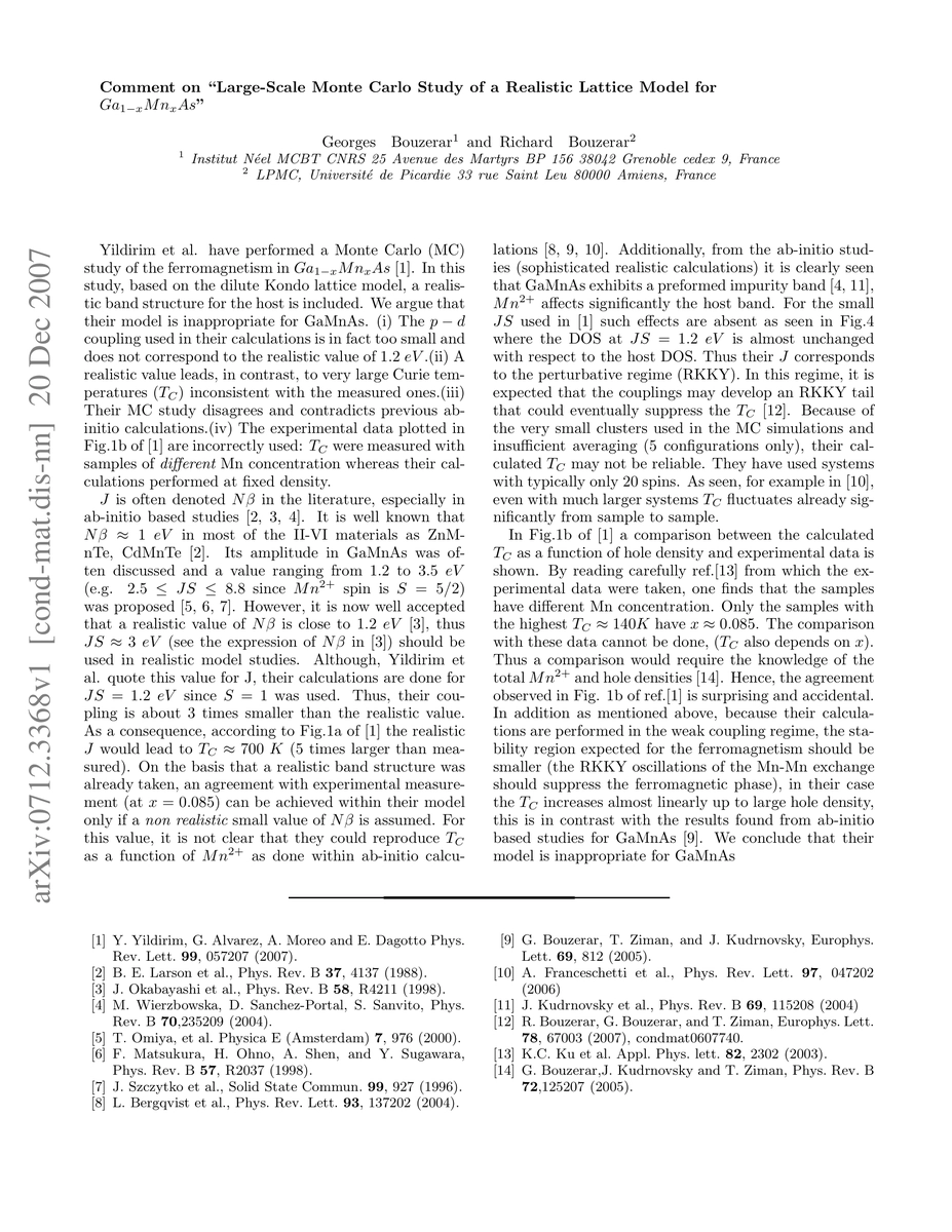 We comment on the recent paper "Large-Scale Monte Carlo Study of a Realistic Lattice Model for Ga_(1-x)Mn_xAs" by Y. Yildirim, G. Alvarez, A. Moreo and E. Dagotto", Phys Rev. Lett.{\bf 99}, 057207 (2007); cond-mat/0612002