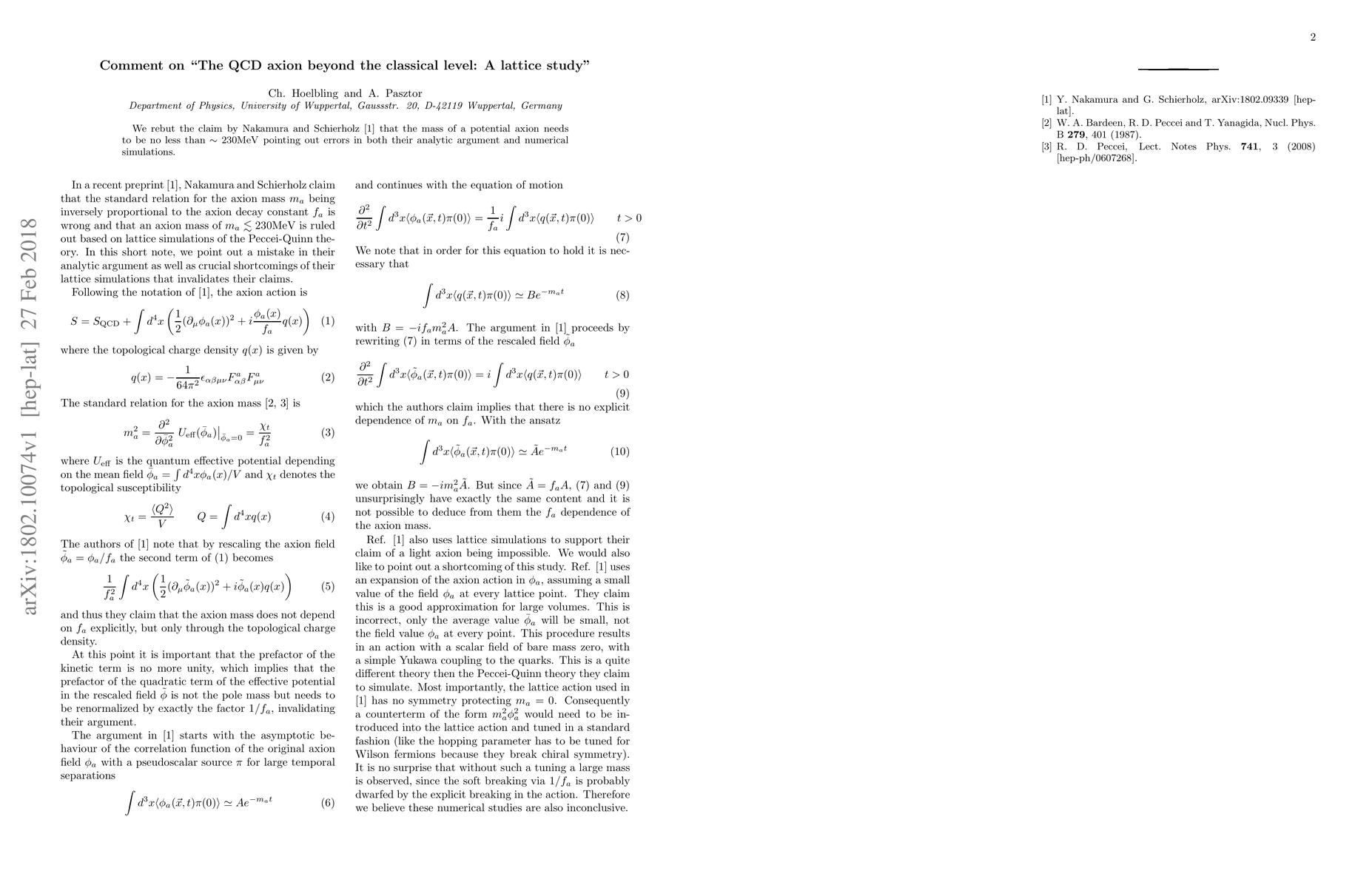 We rebut the claim by Nakamura and Schierholz [1] that the mass of a potential axion needs to be no less than ~230MeV pointing out errors in both their analytic argument and numerical simulations.
