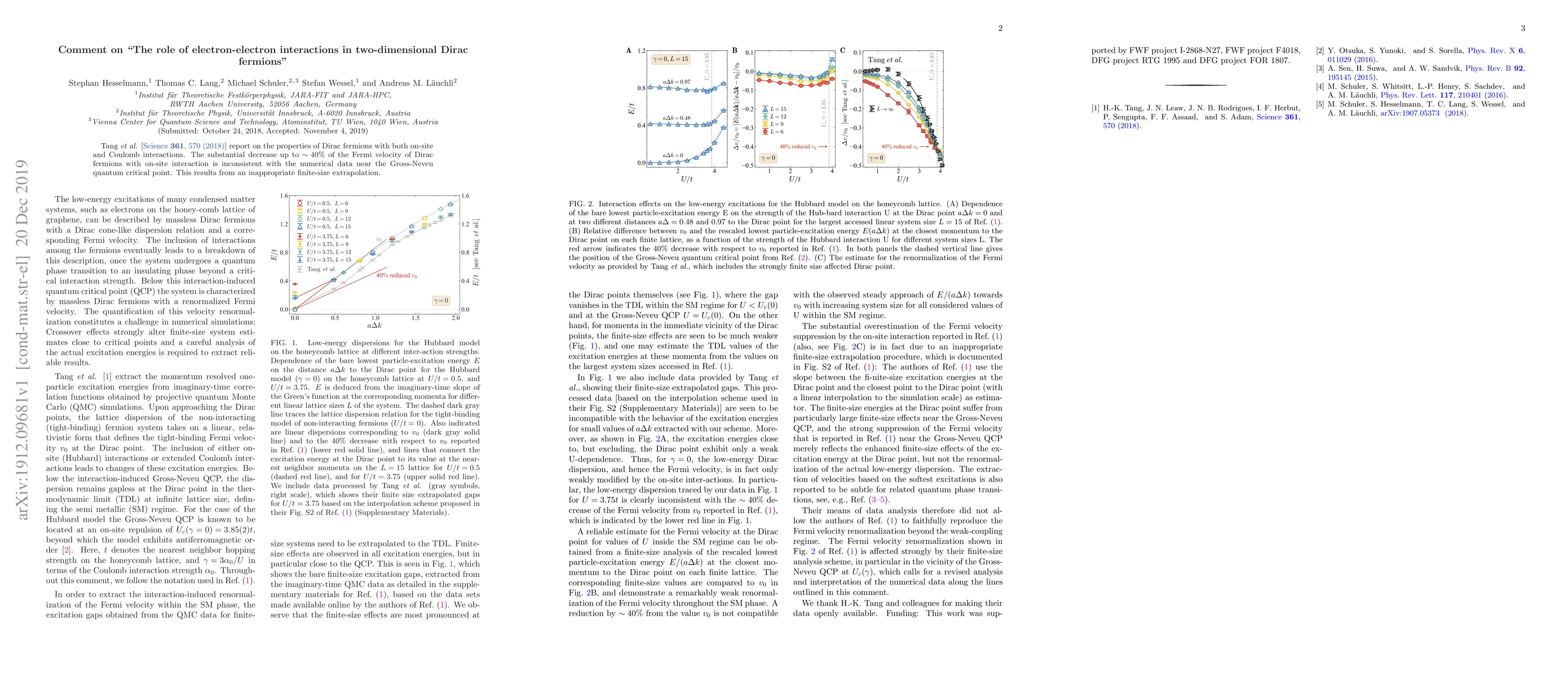 Tang et al. [Science 361, 570 (2018)] report on the properties of Dirac fermions with both on-site and Coulomb interactions. The substantial decrease up to ~40% of the Fermi velocity of Dirac fermions with on-site interaction is inconsistent with the numerical data near the Gross-Neveu quantum critical point. This results from an inappropriate finite-size extrapolation.
