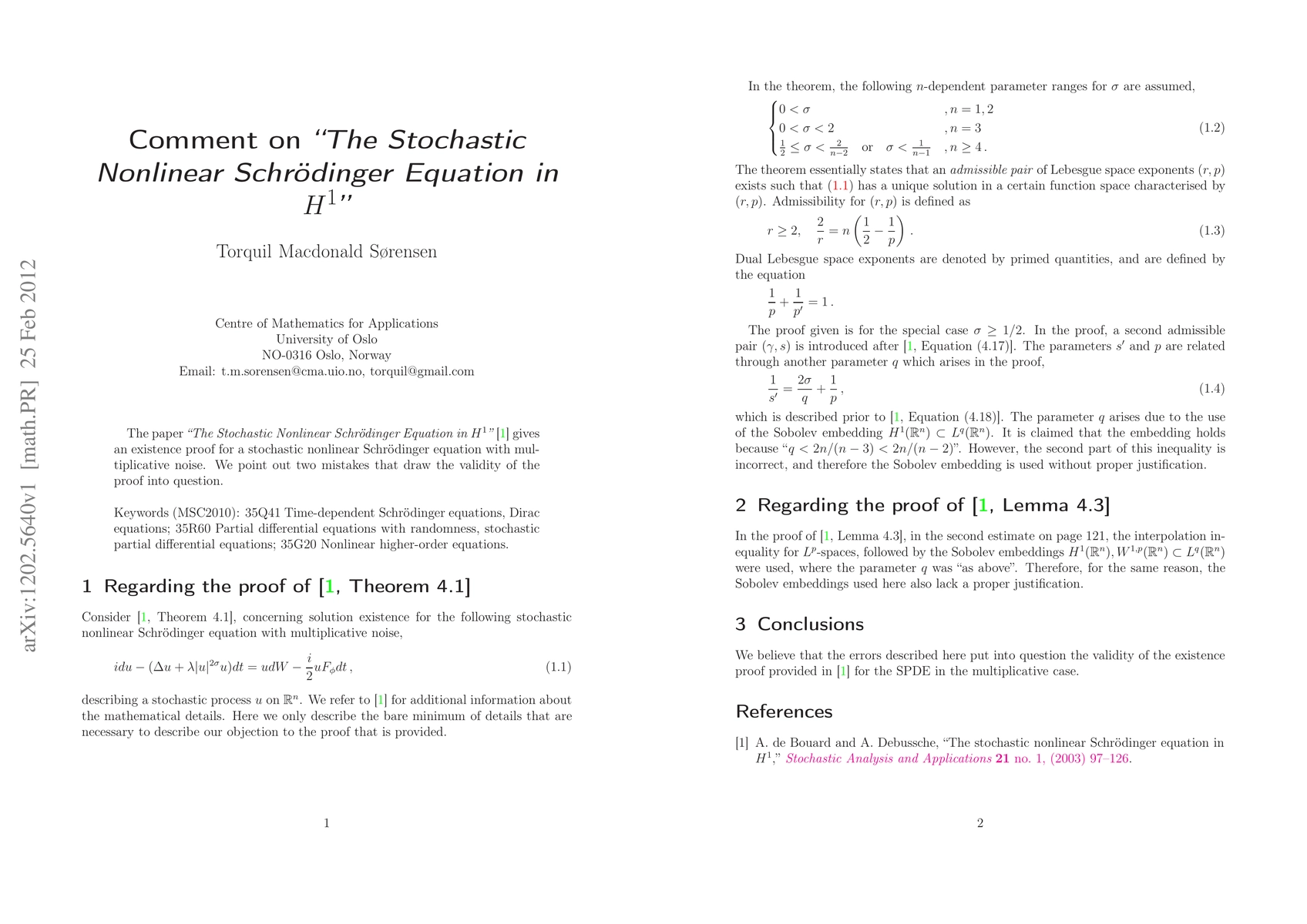 The paper "The Stochastic Nonlinear Schr\"odinger Equation in $H^{1}$" \cite{debouard2003} gives an existence proof for a stochastic nonlinear Schr\"odinger equation with multiplicative noise. We point out two mistakes that draw the validity of the proof into question.